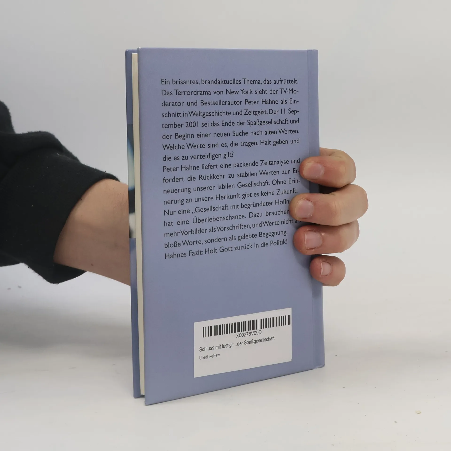 Ein brisantes, brandaktuelles Thema, das aufrüttelt. Endlich gibt es den viel beachteten Vortrag von Peter Hahne als Buch. Wo immer der Berliner Topjournalist in den letzten Monaten auf Einladung von Kirchen, Wirtschaftsverbänden oder Banken sprach: Die Hallen waren überfüllt, das Presseecho überschwänglich. Das Terrordrama von New York sieht Hahne als Einschnitt in Weltgeschichte und Zeitgeist. Der 11. September 2001 sei das Ende der Spaßgesellschaft und der Beginn einer neuen Suche nach alten Werten. Welche Werte sind es, die tragen, Halt geben und die es zu verteidigen gilt? Peter Hahne liefert eine packende Zeitanalyse und fordert die Rückkehr zu stabilen Werten zur Erneuerung unserer labilen Gesellschaft. Ohne Erinnerung an unsere christliche Herkunft gibt es keine Zukunft. Hahnes Fazit: Holt Gott zurück in die Politik!