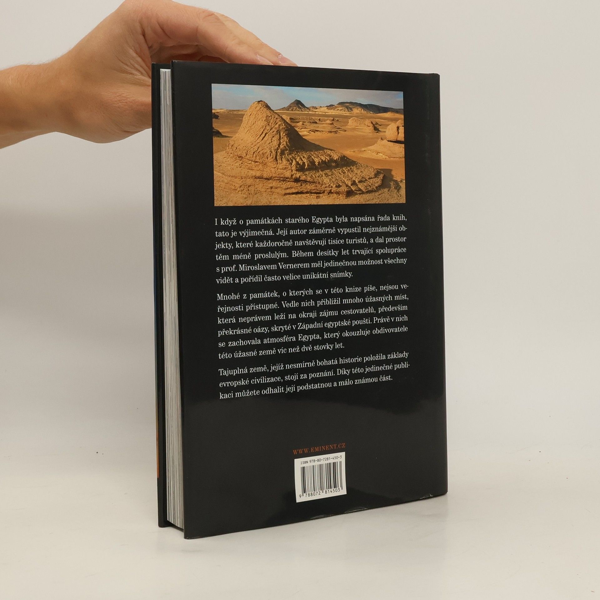 I když o památkách starého Egypta byla napsána řada knih, tato je výjimečná. Její autor záměrně vypustil nejznámější objekty, které každoročně navštěvují tisíce turistů, a dal prostor těm méně proslulým. Během svojí desítky let trvající spolupráce s prof. Miroslavem Vernerem měl jedinečnou možnost všechny vidět a pořídil často velice unikátní snímky. Mnohé z památek, o kterých se v této knize píše, nejsou veřejnosti přístupné. Vedle nich přiblížil mnoho úžasných míst, která neprávem leží na okraji zájmu cestovatelů, především překrásné oázy, skryté v Západní egyptské poušti. Právě v nich se zachovala atmosféra Egypta, který okouzluje obdivovatele této úžasné země víc než dvě stovky let. Tajuplná země, jejíž nesmírně bohatá historie položila základy evropské civilizace, stojí za poznání. Díky této jedinečné publikaci můžete odhalit její podstatnou a málo známou část.