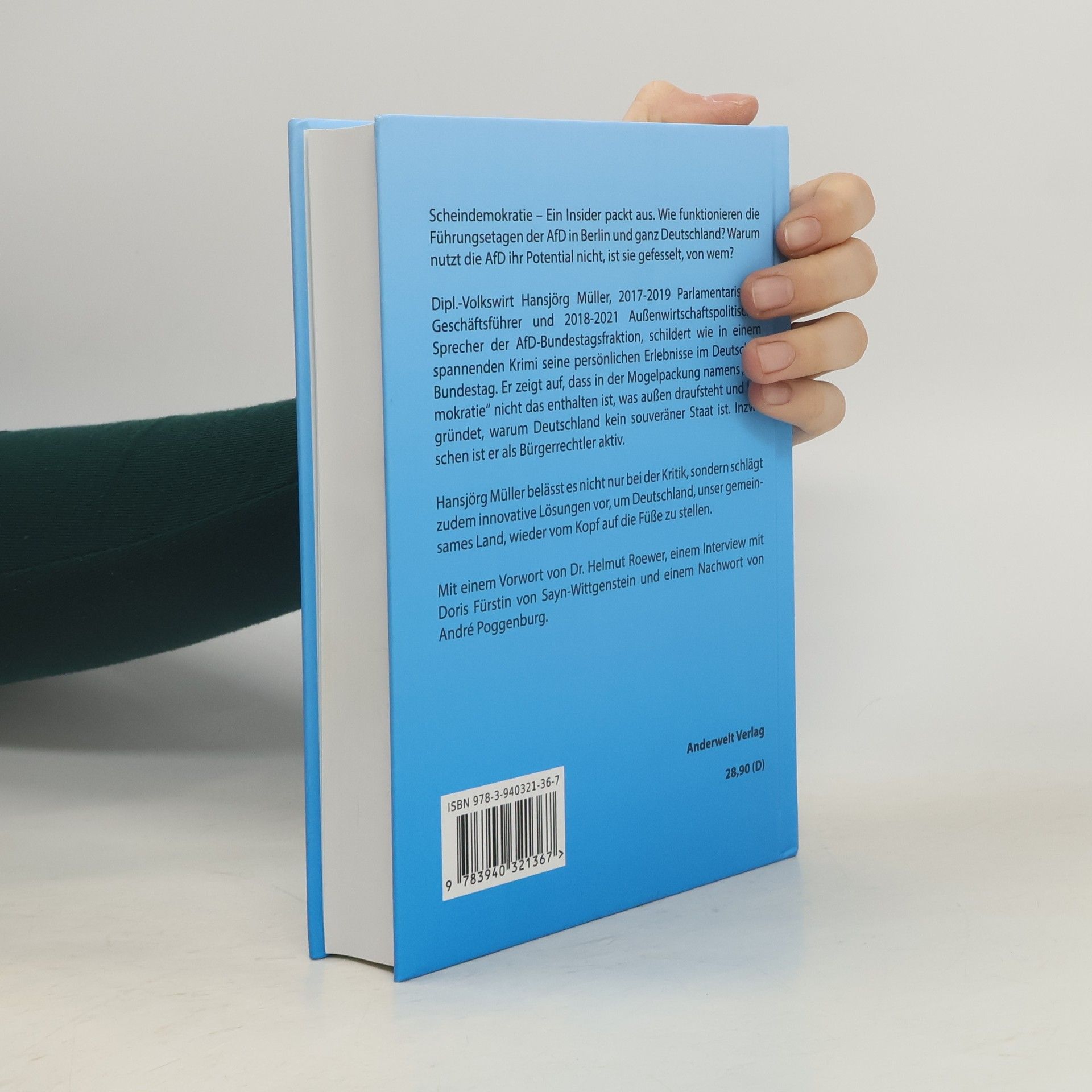 Scheindemokratie – Ein Insider packt aus. Wie funktionieren die Führungsetagen der AfD in Berlin und ganz Deutschland? Warum nutzt die AfD ihr Potential nicht, ist sie gefesselt, von wem? Dipl.-Volkswirt Hansjörg Müller, 2017-2019 Parlamentarischer Geschäftsführer und 2018-2021 Außenwirtschaftspolitischer Sprecher der AfD-Bundestagsfraktion, schildert wie in einem spannenden Krimi seine persönlichen Erlebnisse im Deutschen Bundestag. Er zeigt auf, dass in der Mogelpackung namens „Demokratie“ nicht das enthalten ist, was außen draufsteht und begründet, warum Deutschland kein souveräner Staat ist. Inzwischen ist er als Bürgerrechtler aktiv. Hansjörg Müller belässt es nicht nur bei der Kritik, sondern schlägt zudem innovative Lösungen vor, um Deutschland, unser gemeinsames Land, wieder vom Kopf auf die Füße zu stellen. Mit einem Vorwort von Dr. Helmut Roewer, einem Interview mit Doris Fürstin von Sayn-Wittgenstein und einem Nachwort von André Poggenburg
