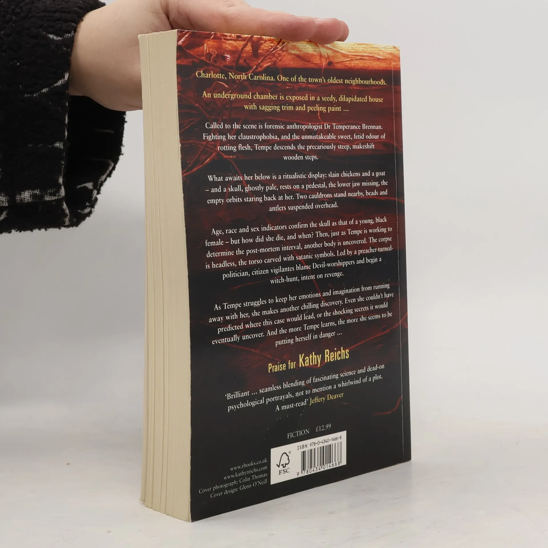 Charlotte, North Carolina. One of the town's oldest neighbourhoods. An underground chamber is exposed in a seedy, dilapidated house with sagging trim and peeling painta Called to the scene is forensic anthropologist Dr Temperance Brennan. Fighting her claustrophobia, and the unmistakeable sweet, fetid odour of rotting flesh, Tempe descends the precariously steep, makeshift wooden steps. What awaits her below is a ritualistic display: slain chickens and a goat u and a skull, ghostly pale, rests on a pedestal, the lower jaw missing, the empty orbits staring back at her. Two cauldrons stand nearby, beads and antlers suspended overhead. Age, race and sex indicators confirm the skull as that of a young, black female u but how did she die, and when? Then, just as Tempe is working to determine the post-mortem interval, another body is uncovered. The corpse is headless, the torso is carved with Satanic symbols. Led by a preacher-turned-politician, citizen vigilantes blame Devil-worshippers and begin a witch-hunt, intent on revenge. As Tempe struggles to keep her emotions and imagination from running away with her, she makes another chilling discovery. Even she couldn't have predicted where this case would lead, or the shocking secrets it would eventually uncover. And the more Tempe learns, the more she seems to be putting herself in dangera