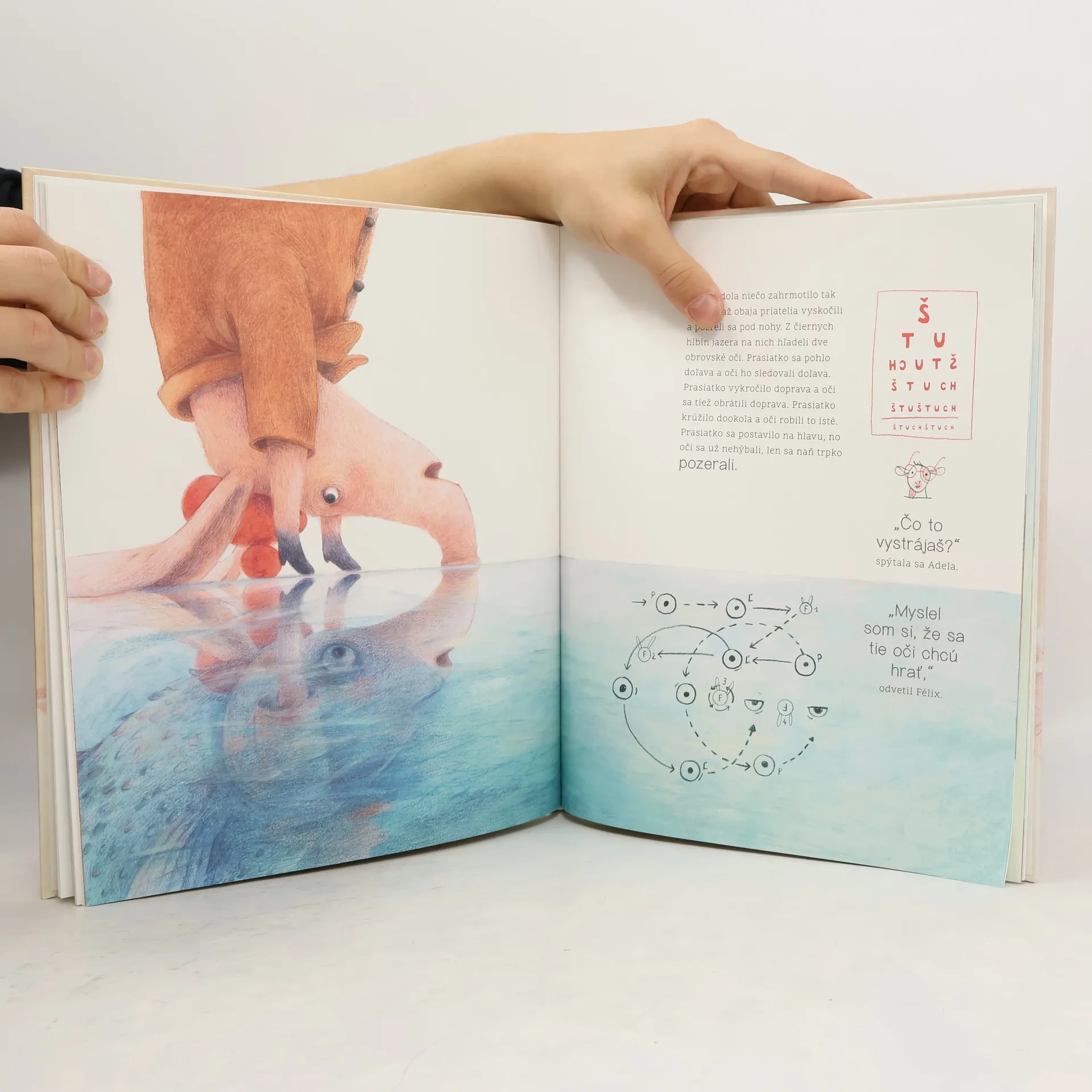Krásne ilustrovaná zimná obrázková kniha o priateľstve a súcite s blížnymi Inteligentné prasiatko Félix, ktoré rado píše básne, a zdvorilá kravička Adelka sú najlepší priatelia. Jedného krásneho zimného dňa sa Félix rozhodne korčuľovať na ľade, no sám sa nudí, a tak pozve kamarátku Adelku. Kravička má najprv problémy zvládnuť korčuľovanie, no napokon sa kamaráti výborne zabávajú. Až do chvíle, kým si nesadnú na ľad, aby si oddýchli. Niečo pod nimi začne lomoziť. Kto je to, čo chce a prečo má také zvláštne meno: ABYR? Aké tajomstvá sa skrývajú v čiernych hlbinách jazera, kde žijú príšery s obrovskými čeľusťami? Čo hrozí krave a prasiatku? Čo ak majú príšery problémy a potrebujú pomoc? Budú mať naši hrdinovia dosť odvahy a čo zvíťazí? Statočnosť a priateľstvo alebo strach? Nádherný príbeh o úprimnom priateľstve nám dáva lekciu empatie, prečo je súcit a ochota pomáhať druhým taká dôležitá. Odvážni a priateľskí hrdinovia Adelka a Félix naučia deti nebáť sa ľudí, ktorí sú iní, a toho, že naše jazyky môžu byť odlišné. Ich svet je plný snov, objavov a nápadov. Využite svoju schopnosť čítať slová a vety odzadu, aby to bola ešte väčšia zábava! Pre deti od 4 rokov Z anglickej verzie originálneho litovského vydania preložila Lucia Hlubeňová.