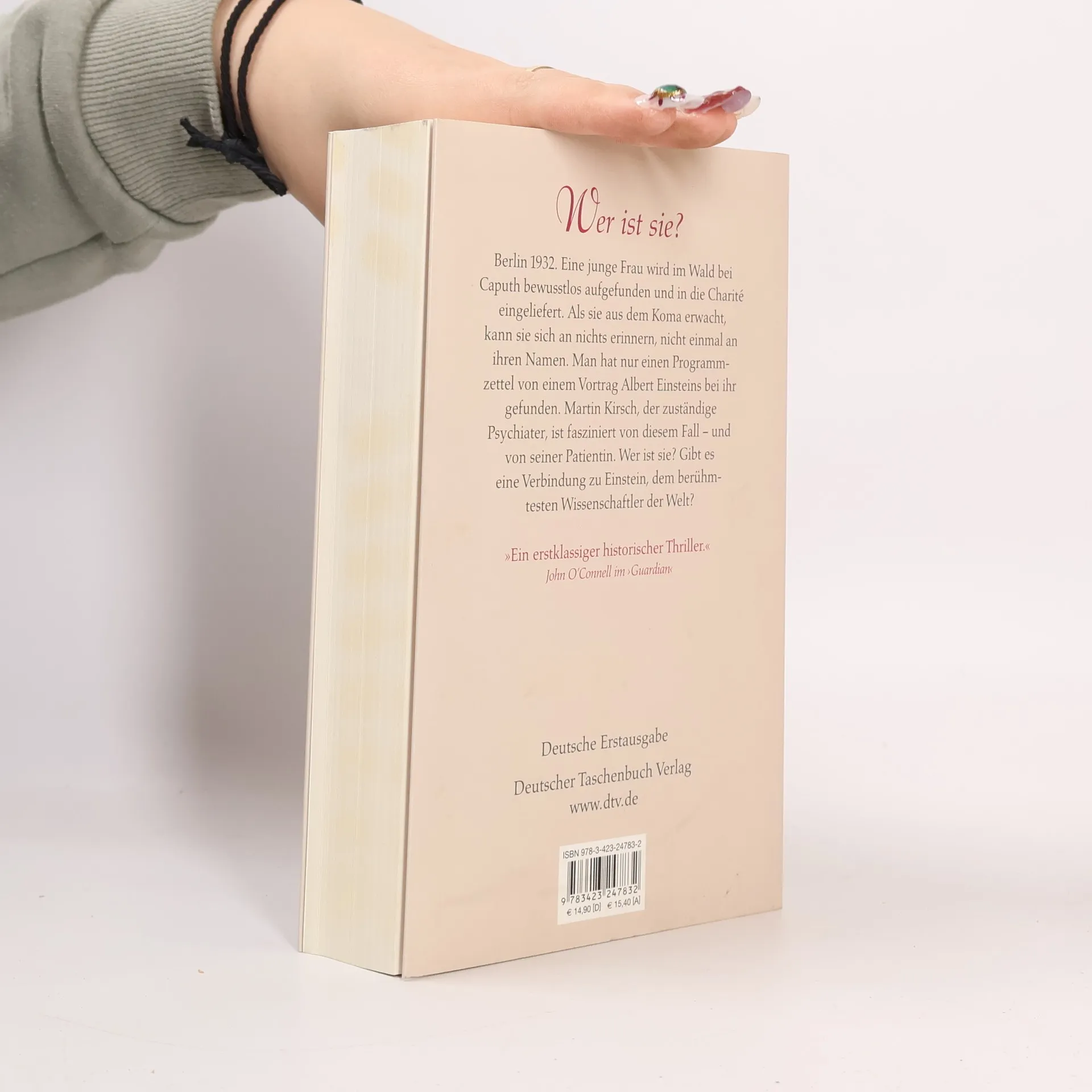 Berlin 1932. Eine junge Frau wird im Wald bei Caputh bewusstlos aufgefunden und in die Charité eingeliefert. Als sie aus dem Koma erwacht, kann sie sich an nichts erinnern, nicht einmal an ihren Namen. Bei ihr findet man nur einen Programmzettel von einem Vortrag Albert Einsteins. Martin Kirsch, der zuständige Psychiater, ist fasziniert von diesem ungewöhnlichen Fall – und von seiner Patientin. Wer ist diese Frau? Gibt es eine Verbindung zu Einstein? Seine Nachforschungen führen ihn nach Zürich und bis nach Serbien. Währenddessen ergreifen in Deutschland die Nazis die Macht.