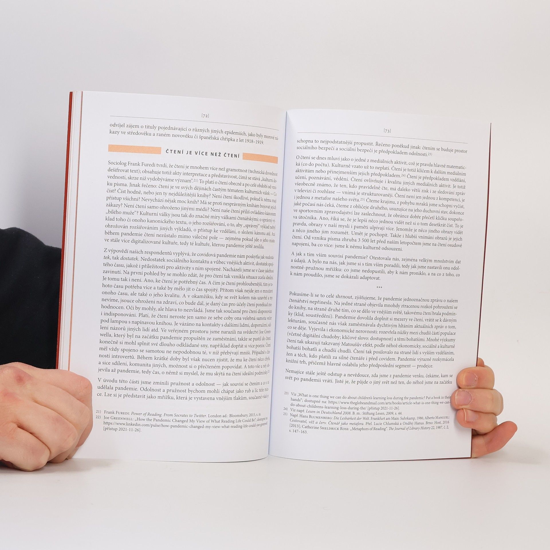 Publikace vychází ze statistického šetření, organizovaného Národní knihovnou ČR v únoru 2021. Přináší data týkající se našeho chování před pandemií covidu-19 a během ní — snaží se zjistit, které mediální aktivity narostly nejvíce, které naopak poklesly, jak se změnily naše čtenářské návyky, jak jsme vnímali u svých dětí to, že byly uzavřené školy. Autoři zasazují získaná data do širšího kontextu kultury a společenských změn, které pandemie přinesla. A zprostředkovávají i zkušenosti z jiných zemí. Vydáno ve spolupráci s Národní knihovnou České republiky.