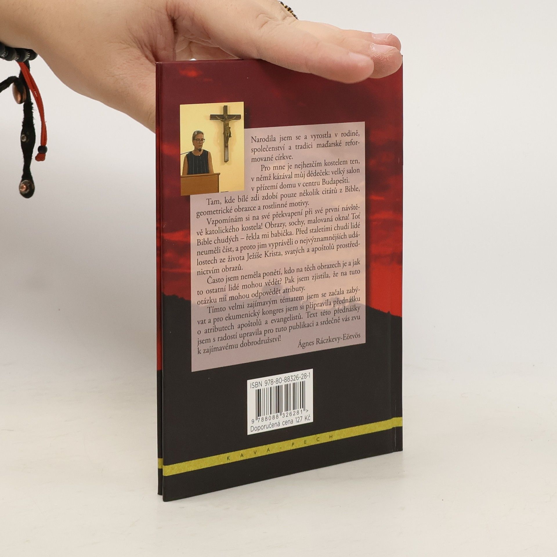 Podrobný popis atributů jednotlivých apoštolů a evangelistů doplněný mnohými ilustracemi. Nezbytná pomůcka nejen každého návštěvníka kostelů, ale i zvídavého turisty, často stojícího před sochou či obrazem některého svatého, netuše o koho se jedná. Takto to popisuje autorka: Narodila jsem se a vyrostla v rodině, společenství a tradici maďarské reformované církve. Pro mne je nejhezčím kostelem ten, v němž kázával můj dědeček: velký salon v přízemí domu v centru Budapešti. Tam, kde bílé zdi zdobí pouze několik citátů z Bible, geometrické obrazce a rostlinné motivy. Vzpomínám si na své překvapení při své první návštěvě katolického kostela! Obrazy, sochy, malovaná okna! Toť Bible chudých - řekla mi babička. Před staletími chudí lidé neuměli číst, a proto jim vyprávěli o nejvýznamnějších událostech ze života Ježíše Krista, svatých a apoštolů prostřednictvím obrazů. Často jsem neměla ponětí, kdo na těch obrazech je a jak to ostatní lidé mohou vědět? Pak jsem zjistila, že na tuto otázku mi mohou odpovědět atributy. Tímto velmi zajímavým tématem jsem se začala zabývat a pro ekumenický kongres jsem si připravila přednášku o atributech apoštolů a evangelistů. Text této přednášky jsem s radostí upravila pro tuto publikaci a srdečně vás zvu k zajímavému dobrodružství! Ágnes Ráczkevy-Eötvös