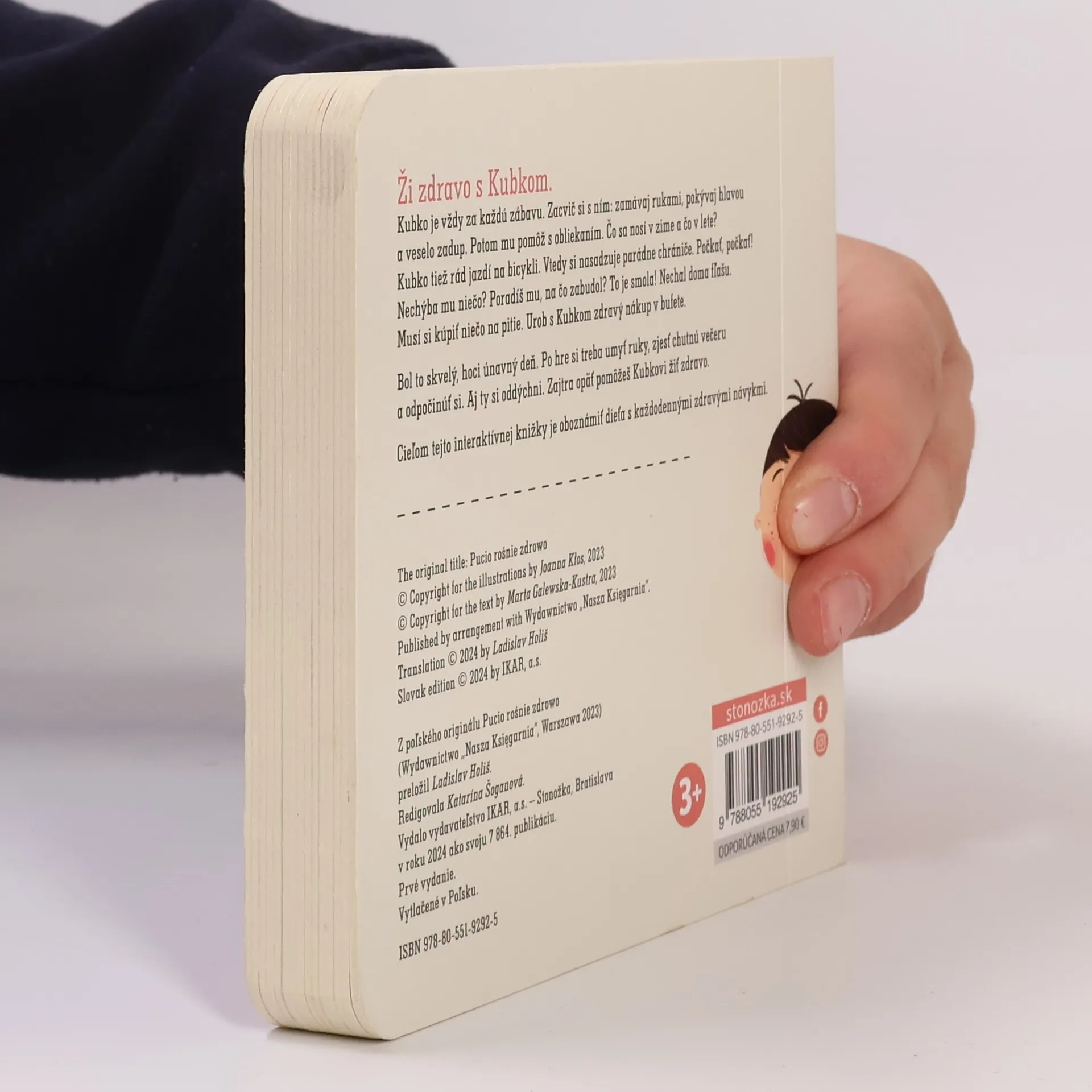 Ži zdravo s Kubkom. Kubko je vždy za každú zábavu. Zacvič si s ním: zamávaj rukami, pokývaj hlavou a veselo zadup. Potom mu pomôž s obliekaním. Čo sa nosí v zime a čo v lete? Kubko tiež rád jazdí na bicykli. Vtedy si nasadzuje parádne chrániče. Počkať, počkať! Nechýba mu niečo? Poradíš mu, na čo zabudol? To je smola! Nechal doma fľašu. Musí si kúpiť niečo na pitie. Urob s Kubkom zdravý nákup v bufete. Kubko zažil skvelý, hoci únavný deň. Po hre si treba umyť ruky, zjesť chutnú večeru a odpočinúť si. Aj ty si oddýchni. Zajtra opäť pomôžeš Kubkovi žiť zdravo. Cieľom tejto interaktívnej knižky je oboznámiť dieťa s každodennými zdravými návykmi. Leporelo má jednoduchú formu, obsahuje krásne ilustrácie a prirodzeným spôsobom zdokonaľuje detskú reč a rozvíja slovnú zásobu. Ilustrovala Joanna Kłos Pre deti od 3 rokov Z poľského originálu preložil Ladislav Holiš.