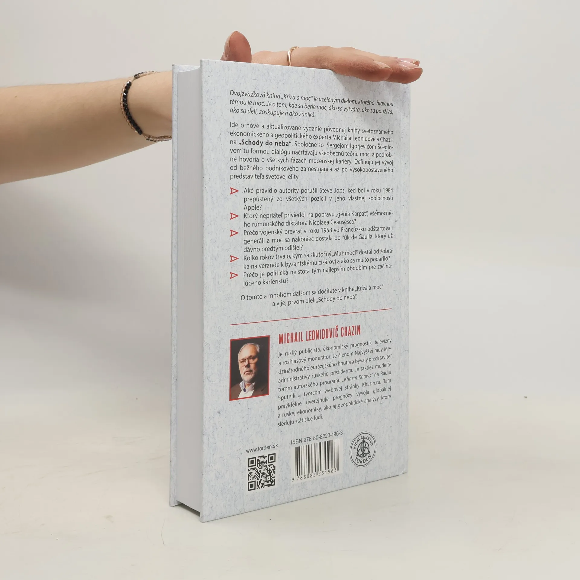 Dvojzväzková kniha “Kríza a moc” je uceleným dielom pojednávajúcim o moci. O tom kde sa berie moc, ako sa vytvára, ako sa používa, ako sa delí, zoskupuje a ako zaniká? Ide v podstate o nové a aktualizované vydanie pôvodnej knihy svetoznámeho ekonomického a geopolitického experta Michaela Leonidoviča Chazina “Schody do neba”. Spoločne so Sergejom Igorjevičom Ščeglovom tu formou dialógu načrtávajú všeobecnú teóriu moci a podrobne hovoria o všetkých fázach mocenskej kariéry. Definujú jej vývoj od bežného podnikového zamestnanca až po vysokopostaveného predstaviteľa svetovej elity. Aké pravidlo autority porušil Steve Jobs, keď bol v roku 1984 prepustený zo všetkých pozícií v jeho vlastnej spoločnosti Apple? Aký nepriateľ priviedol na popravu „génia Karpát“, všemocného rumunského diktátora Nicolaea Ceau ș esca? Prečo vojenský prevrat v roku 1958 vo Francúzsku odštartovali generáli a moc sa nakoniec dostala do rúk de Gaulla, ktorý už dávno predtým odišiel? Koľko rokov trvalo, kým sa skutočný muž Moci dostal od žobráka na verande k byzantskému cisárovi a ako sa mu to podarilo? Prečo je politická neistota tým najlepším obdobím pre začínajúceho kariéristu? O tomto a mnohom ďalšom sa dočítate v knihe „Kríza a moc” a jej prvom dieli “Schody do neba“
