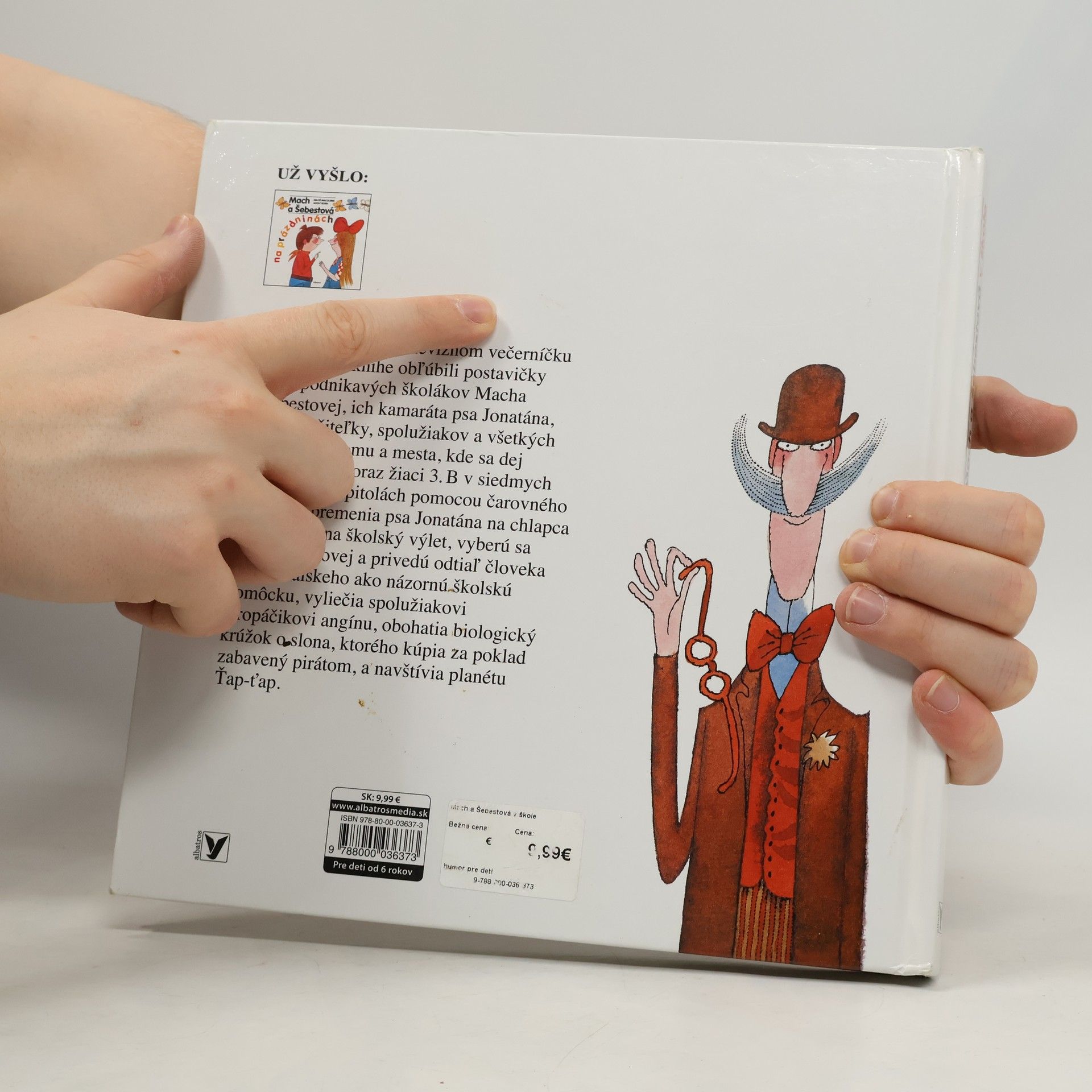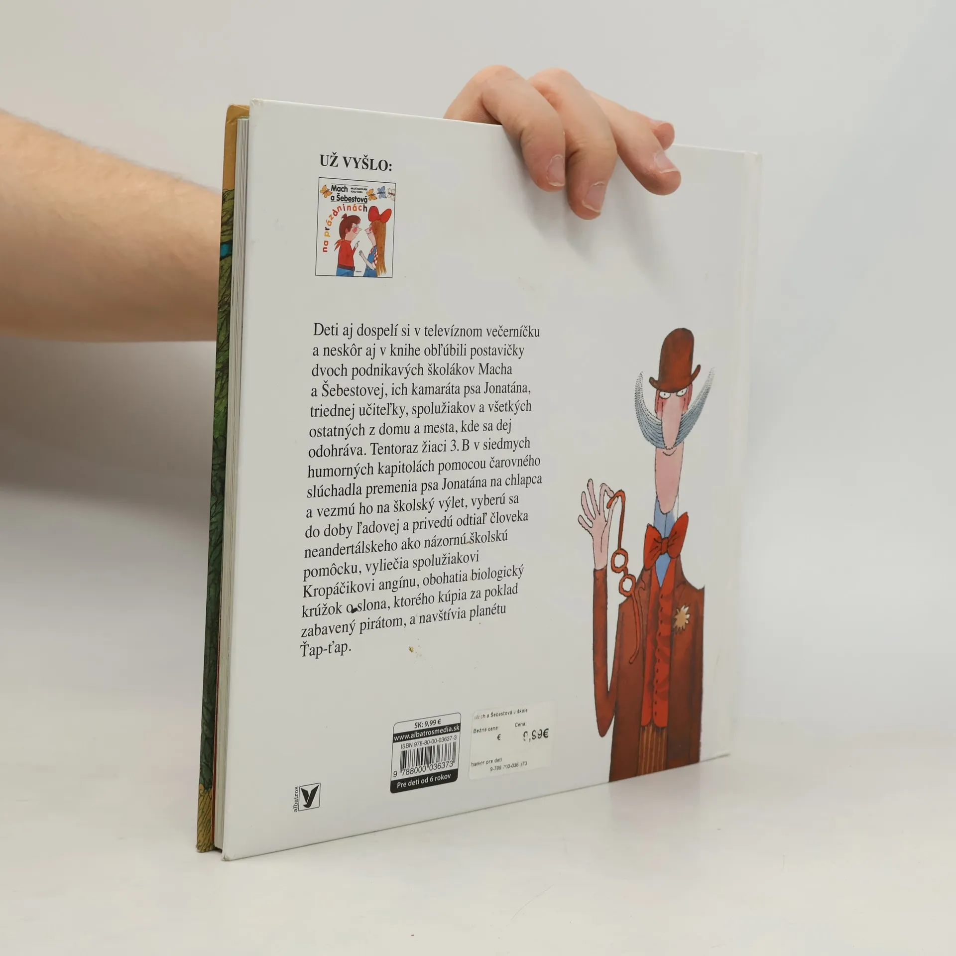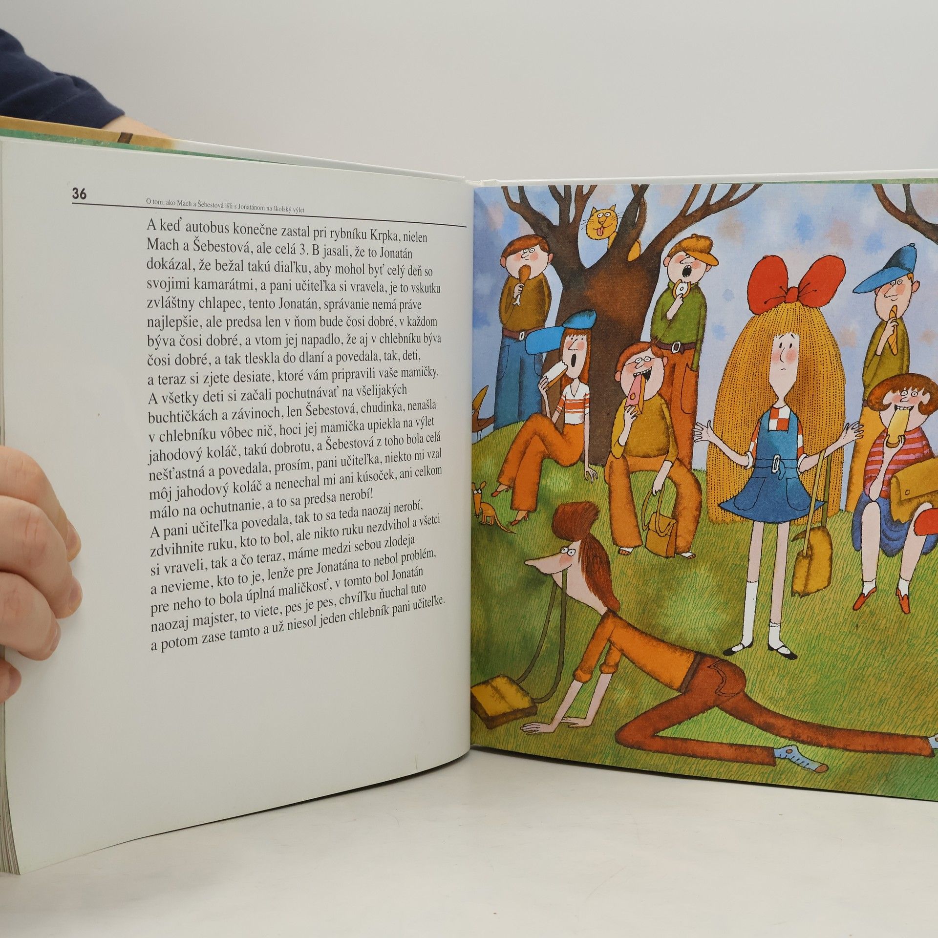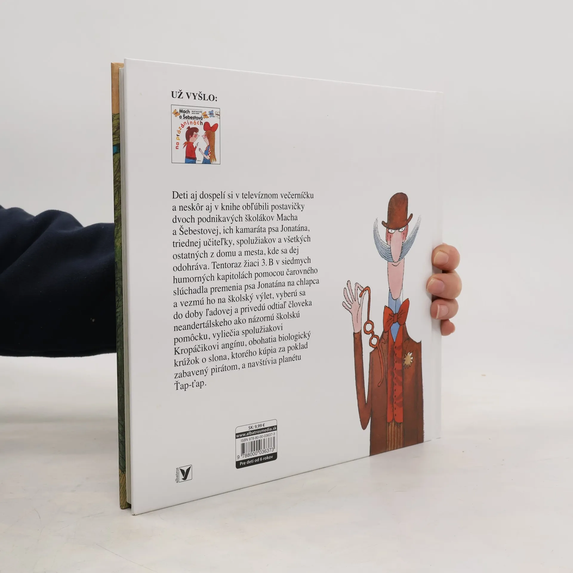Deti aj dospelí si v televíznom večerníčku a neskôr aj v knihe obľúbili postavičky dvoch podnikavých školákov Macha a Šebestovej, ich kamaráta psa Jonatána, triedne učiteľky, spolužiakov a všetkých ostatných z domu a mesta, kde sa dej odohráva. Tentoraz žiaci 3.B v siedmych humorných kapitolách pomocou čarovného slúchadla premenia psa Jonatána na chlapca a vezmú ho na školský výlet, vyberú sa do doby ľadovej a privedú odtiaľ človeka neandertálskeho ako názornú školskú pomôcku a zažijú mnoho ďalších príhod.