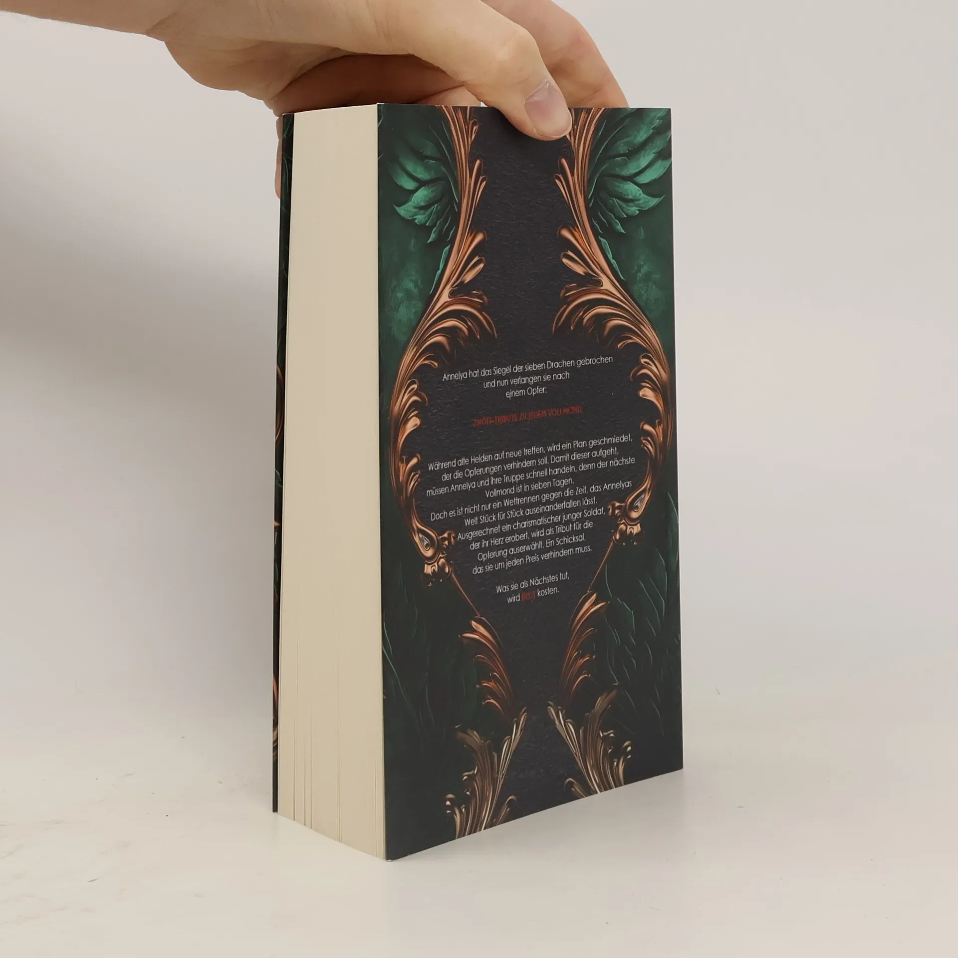 Eine Welt voller Abenteuer, Magie und unerwarteter Liebe. Zwölf Tribute. Sieben Drachen. Ein Schicksal. Annelya hat das Siegel der sieben Drachen gebrochen und nun verlangen sie nach einem Opfer: zwölf Tribute zu jedem Vollmond. Während alte Helden auf neue treffen, wird ein Plan geschmiedet, der die Opferungen verhindern soll. Damit dieser aufgeht, müssen Annelya und ihre Truppe schnell handeln, denn der nächste Vollmond ist in sieben Tagen. Doch es ist nicht nur ein Wettrennen gegen die Zeit, das Annelyas Welt Stück für Stück auseinanderfallen lässt. Ausgerechnet ein charismatischer junger Soldat, der ihr Herz erobert, wird als Tribut für die Opferung auserwählt. Ein Schicksal, das sie um jeden Preis verhindern muss. Was sie als Nächstes tut, wird Blut kosten.
