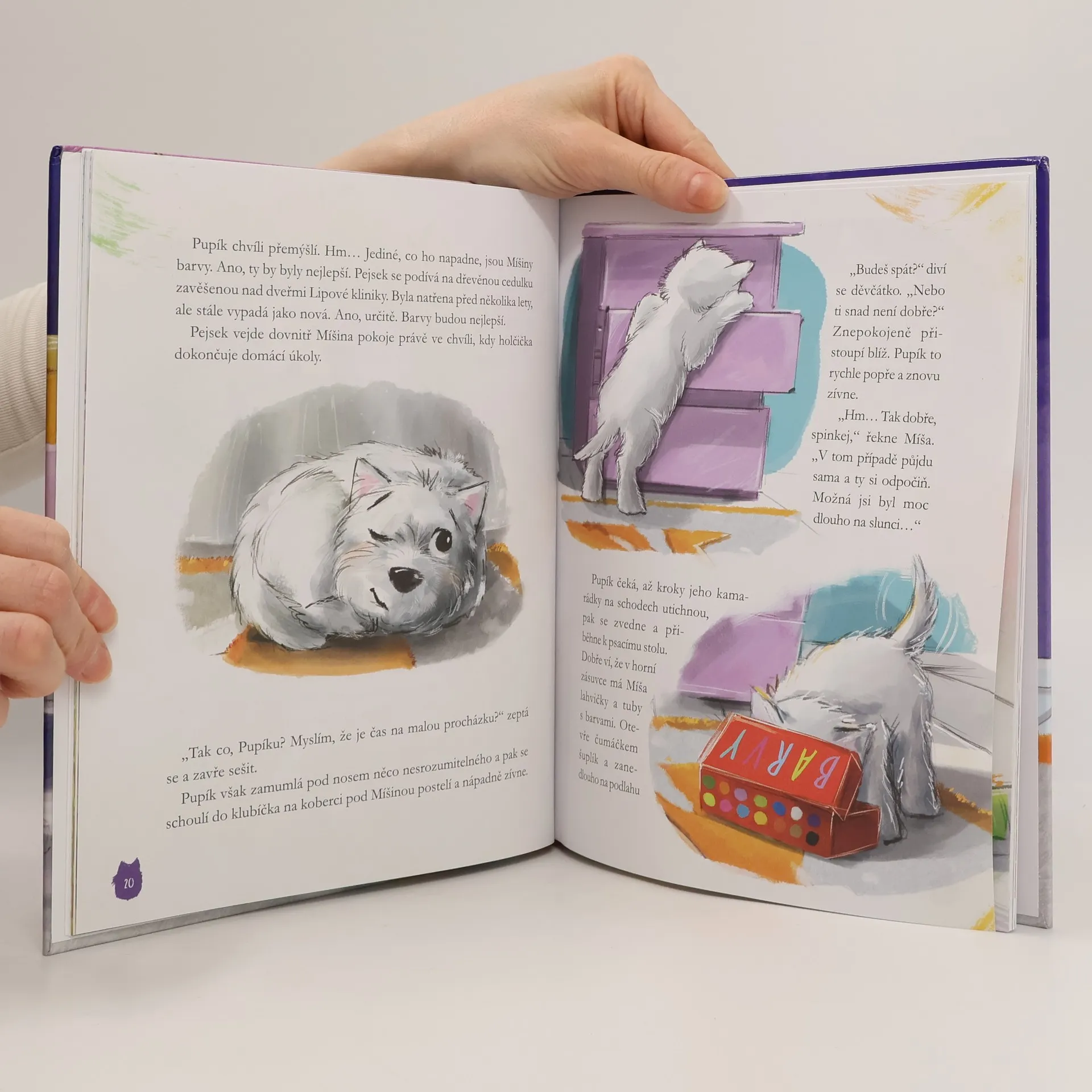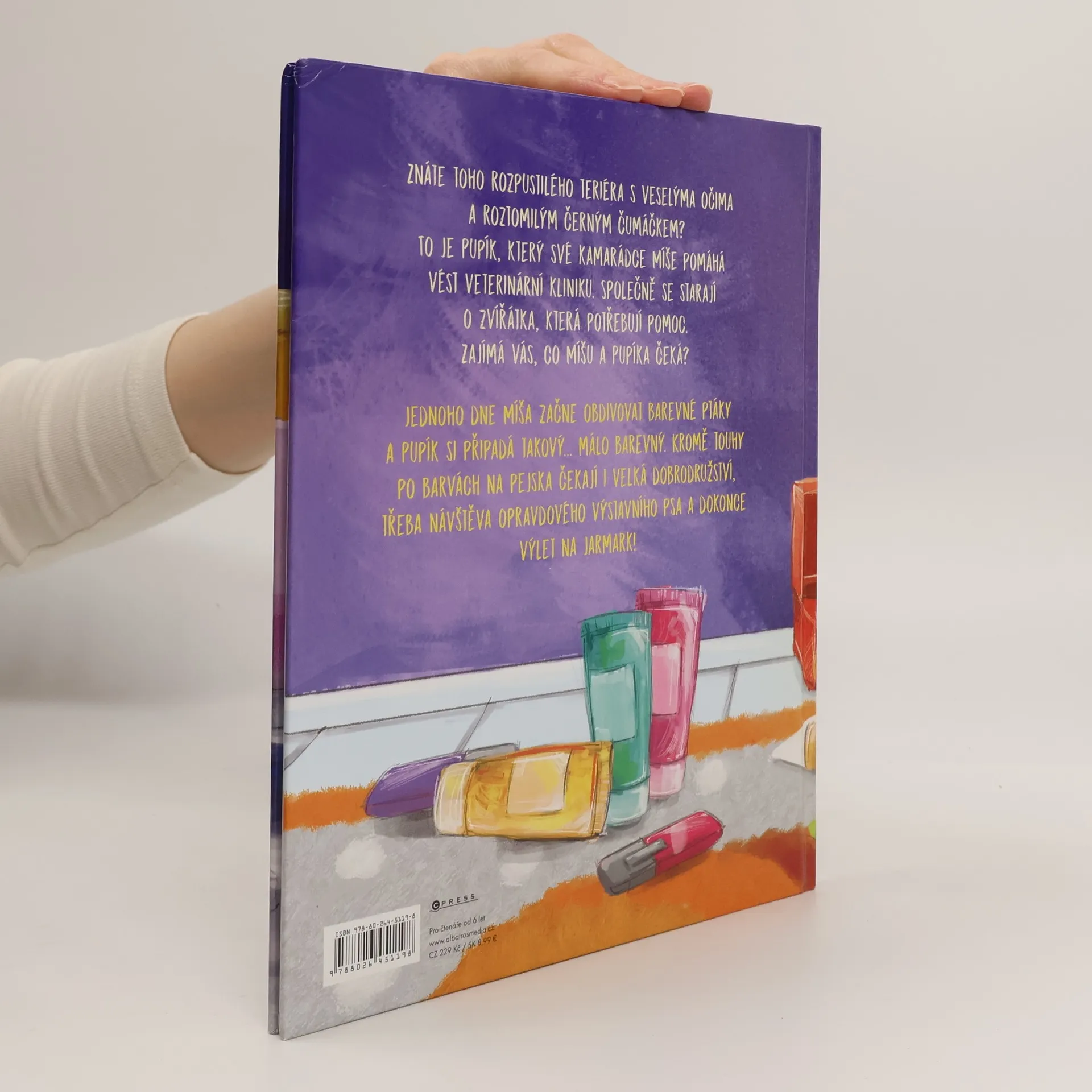 Znáte toho rozpustilého teriéra s veselýma očima a roztomilým černým čumáčkem? To je Pupík, který své kamarádce Míše pomáhá vést veterinární kliniku. Společně se starají o zvířátka, která potřebují pomoc. Zajímá vás, co Míšu a Pupíka čeká? Jednoho dne Míša začne obdivovat barevné ptáky a Pupík si připadá takový málo barevný. Kromě touhy po barvách na pejska čekají i velká dobrodružství, třeba návštěva opravdového výstavního psa a dokonce výlet na jarmark!