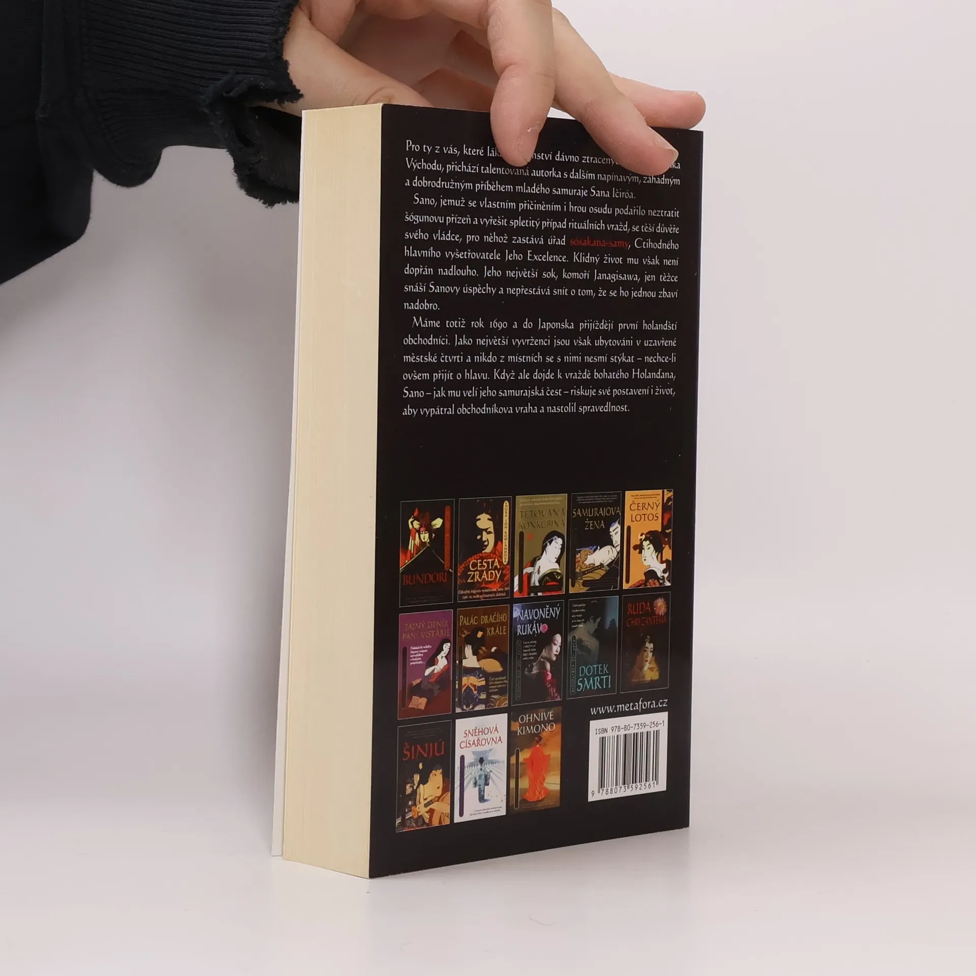 Statečný japonský samuraj pátrá po nemilosrdném vrahovi… Pro ty z vás, které lákají tajemství dávno ztracených časů a exotika Východu, přichází talentovaná autorka s dalším napínavým, záhadným a dobrodružným příběhem mladého samuraje Sana Ičiró. Sano, jemuž se povedlo neztratit šógunovu přízeň a vyřešit spletitý případ rituálních vražd, se těší přízni svého vládce, pro něhož zastává úřad Ctihodného hlavního vyšetřovatele Jeho Excelence. Klidný život mu však není dopřán nadlouho. Máme totiž rok 1690 a do Japonska přijíždějí první holandští obchodníci. Jako největší vyvrženci jsou však ubytováni v uzavřené městské čtvrti a nikdo z místních se s nimi nesmí stýkat - nechce-li ovšem přijít o hlavu. Když ale dojde k vraždě bohatého Holanďana, Sano - jak mu velí jeho samurajská čest - riskuje své postavení i život, aby vypátral obchodníkova vraha a nastolil spravedlnost.