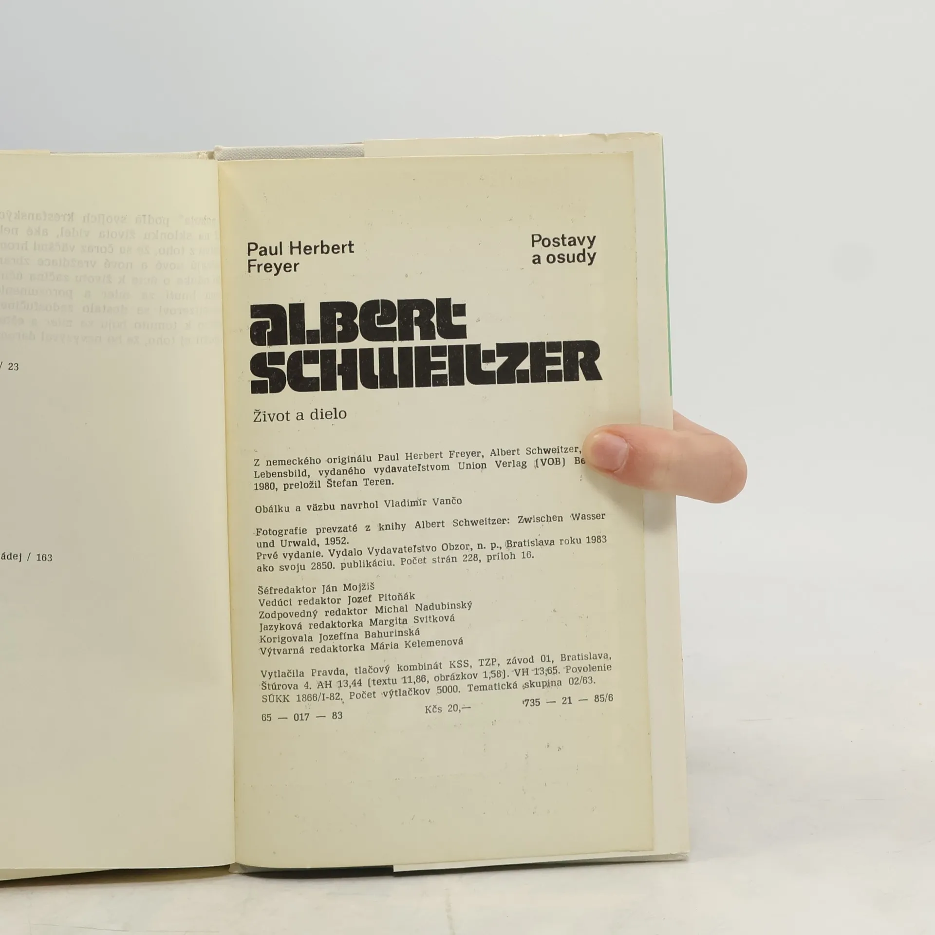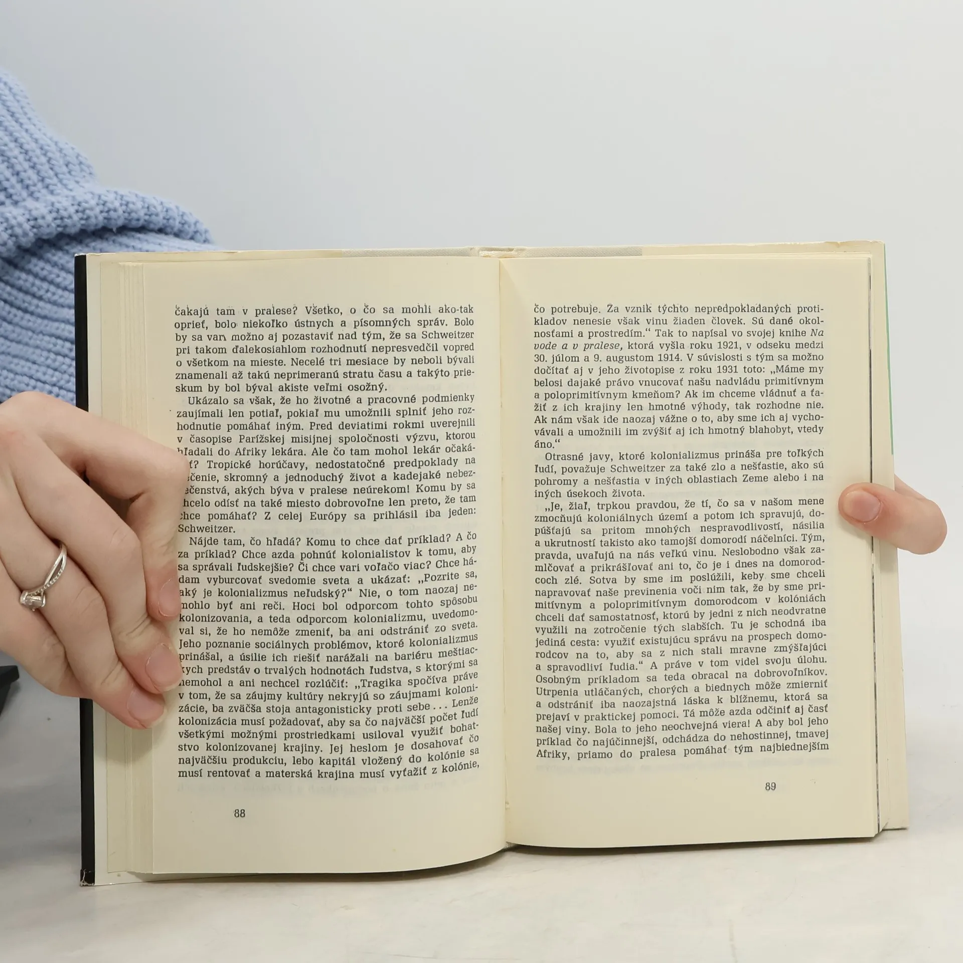 Albert Schweizter bol presvedčený humanista, veľký mysliteľ, historik a vynikajúci organista sa vzdáva sľubnej kariéry vysokoškolského profesora, hudobného virtuóza a uznávaného spisovateľa, aby odišiel roku 1912 ako lekár medzi tých, ktorí ho podľa jeho presvedčenia potrebovali najviac. Veril, že chamtivým kolonializmom opantaným svetom môže účinne pohnúť len osobný príklad. Od tých čias prešli desiatky rokov a nad svetom sa prevalili dve ničivé svetové vojny. Veľmi bezprostredne postihli aj Schweiztera a jeho dielo. Nezlomili však jeho vieru v činorodý humanizmus a v zdravý rozum. Prichádza k poznaniu, že jedinou záchranou ľudstva pred hroziacou skazou je a zostáva iba dôsledný boj všetkých statočných ľudí za mier. S celou váhou svojej autority, ktorú uznávajú vedci, umelci i politici, vydáva výzvy za odzbrojenie a zrieknutie sa jadrových zbraní. O Albertovi Schweizterovi a jeho chýrnej lambarénskej nemocnici v pralese rovníkovej Afriky bolo už napísaných vyše 600 kníh. Jeho vlastné filozofické, odborné i belestricko-náučné knihy vyšli v státisícových nákladoch a prekladajú ich do všetkých svetových jazykoch.