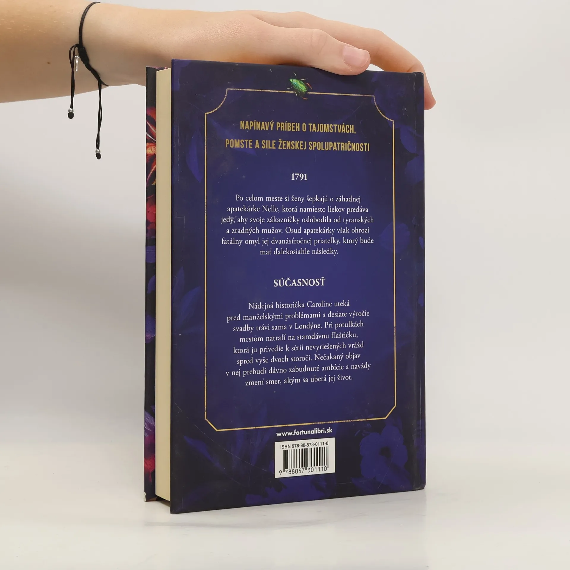 Napínavý príbeh o tajomstvách, pomste a sile ženskej spolupatričnosti 1791 Tajný obchod s liekmi a jedmi, ukrytý v hlbinách Londýna z 18. storočia, vychádza v ústrety neobvyklému druhu klientely. Ženy po celom meste vyhľadávajú tajomnú Nellu, ktorá predáva jedy, aby ich potom mohli použiť proti tyranským a zradným mužom vyskytujúcim sa v ich živote. Osud apatiekárky však ohrozí fatálny omyl jej dvanásťročnej priateľky, ktorého následky sa tiahnu ďaleko do budúcnosti. Súčasnosť Nádejná historička Caroline uteká pred manželskými problémami a desiate výročie svadby trávi sama v Londýne. Pri potulkách mestom natrafí na starodávnu fľaštičku, ktorá ju privedie k sérii nevyriešených vrážd spred vyše dvoch storočí. Nečakaný objav v nej prebudí dávno zabudnuté ambície a navždy zmení smer, akým sa uberá jej život.