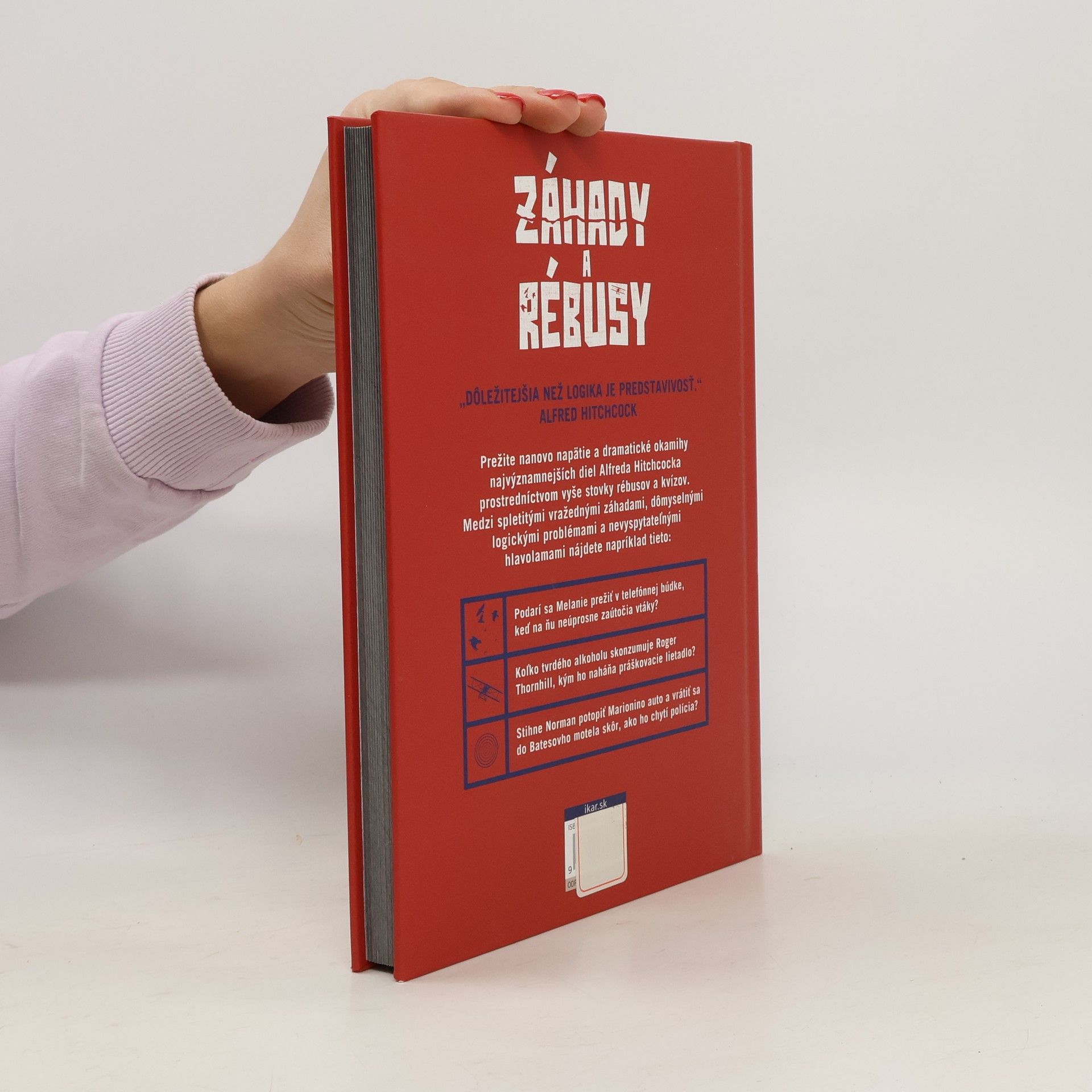 „Dôležitejšia než logika je predstavivosť.“ ALFRED HITCHCOCK Prežite nanovo napätie a dramatické okamihy najvýznamnejších diel Alfreda Hitchcocka prostredníctvom vyše stovky rébusov a kvízov. Medzi spletitými vražednými záhadami, dômyselnými logickými problémami a nevyspytateľnými hlavolamami nájdete napríklad tieto: Podarí sa Melanie prežiť v telefónnej búdke, keď na ňu neúprosne zaútočia vtáky? Koľko tvrdého alkoholu skonzumuje Roger Thornhill, kým ho naháňa práškovacie lietadlo? Stihne Norman potopiť Marionino auto a vrátiť sa do Batesovho motela skôr, ako ho chytí polícia?