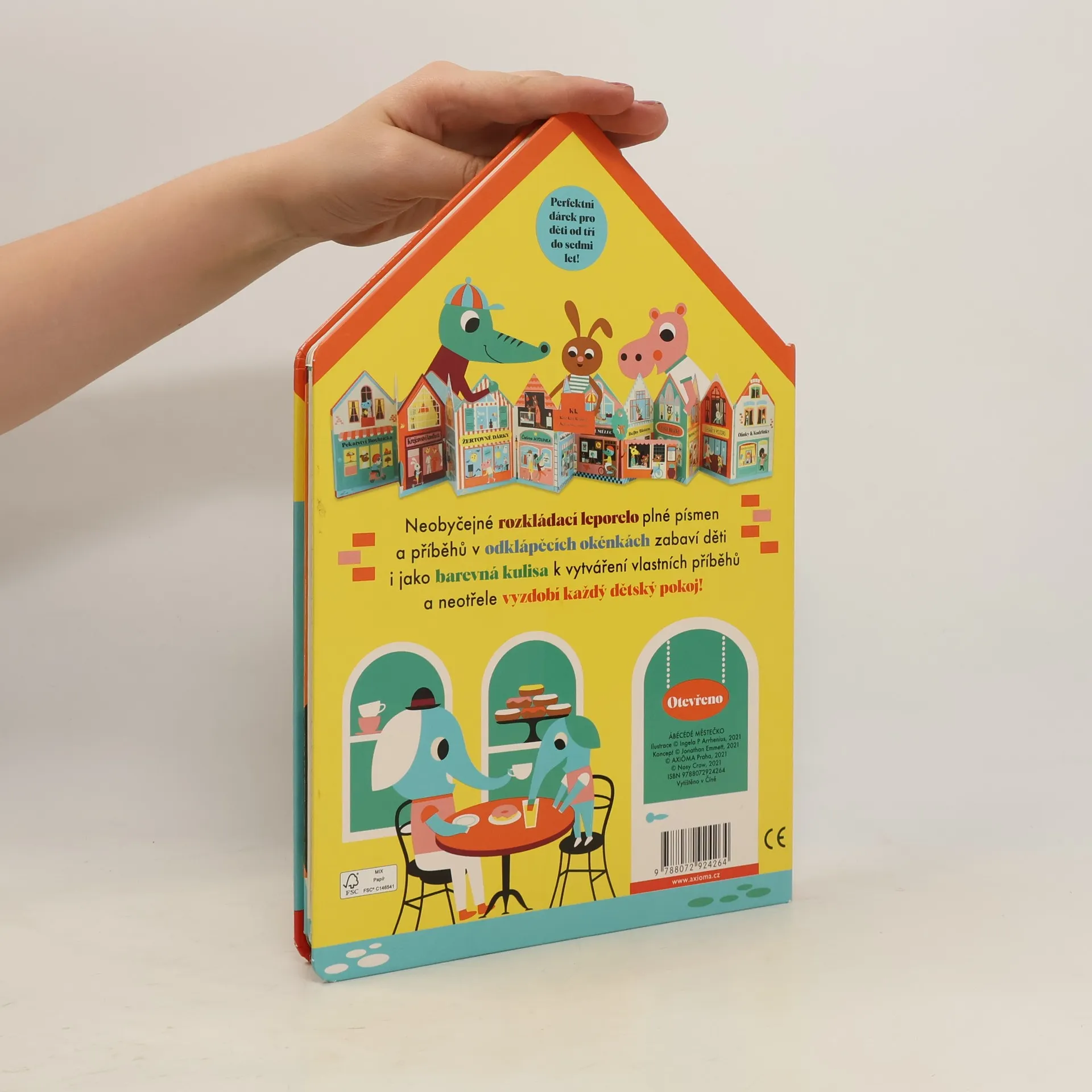 Obří rozkládací leporelo ve tvaru domečku (po rozložení má délku 2,5 m). Procházku po obchodech městečka dětem zpříjemní dvě odklápěcí okénka na každé stránce, která jim postupně představí všechna písmena české abecedy formou krátkých, veselých textů. Zadní stranu leporela tvoří barevná kulisa výletu za město, před kterou si děti mohou zahrát třeba divadélko nebo si vymýšlet své vlastní příběhy. Leporelo může také sloužit jako dekorace do dětského pokojíčku. Rozvíjí jemnou motoriku a povzbudí děti v poznávání barev a pojmenovávání zvířátek a věcí. Pro starší děti je idelání pomůckou k seznámení se a naučení písmen abecedy. Tato interaktivní hračka je určena pro děti od 3 do 7 let.