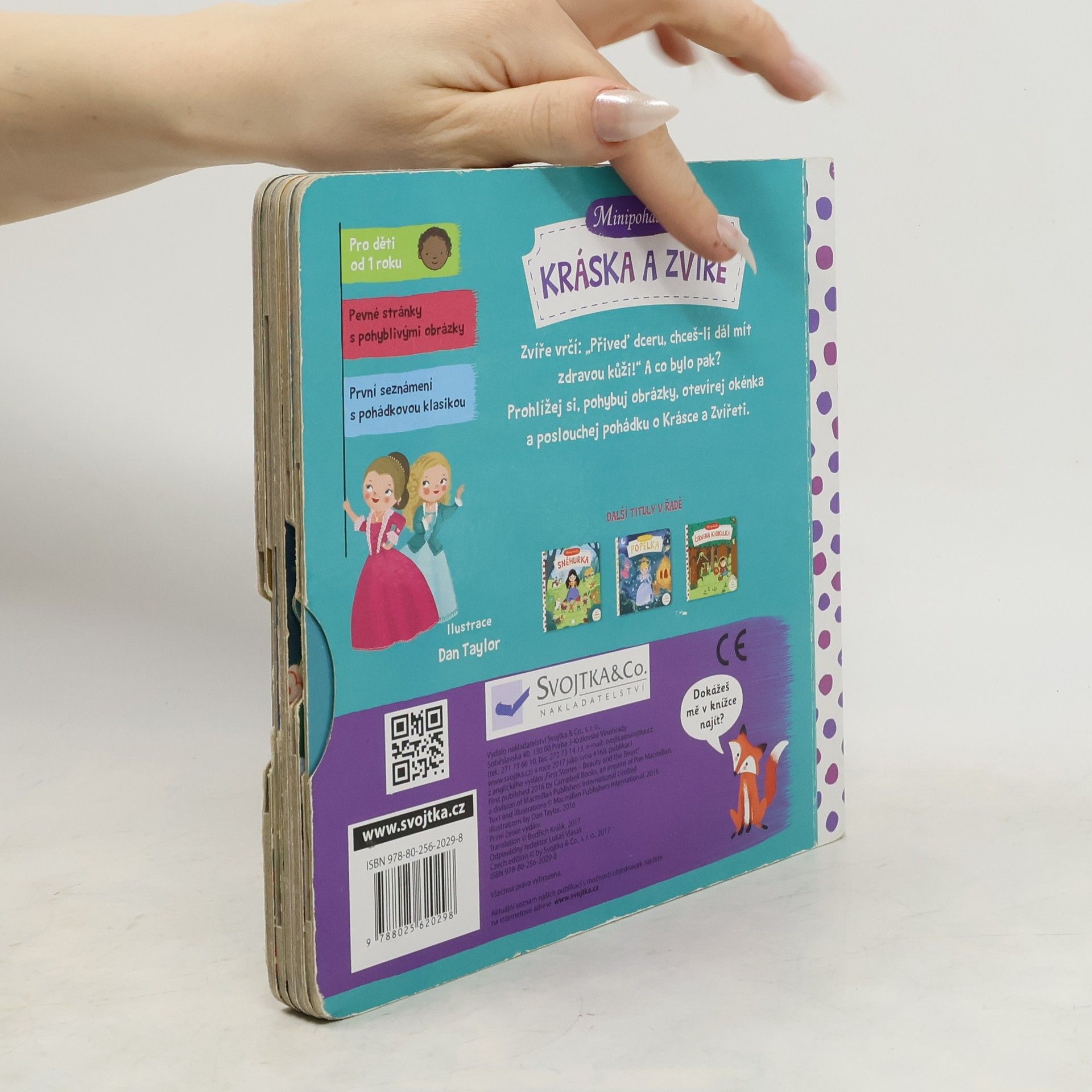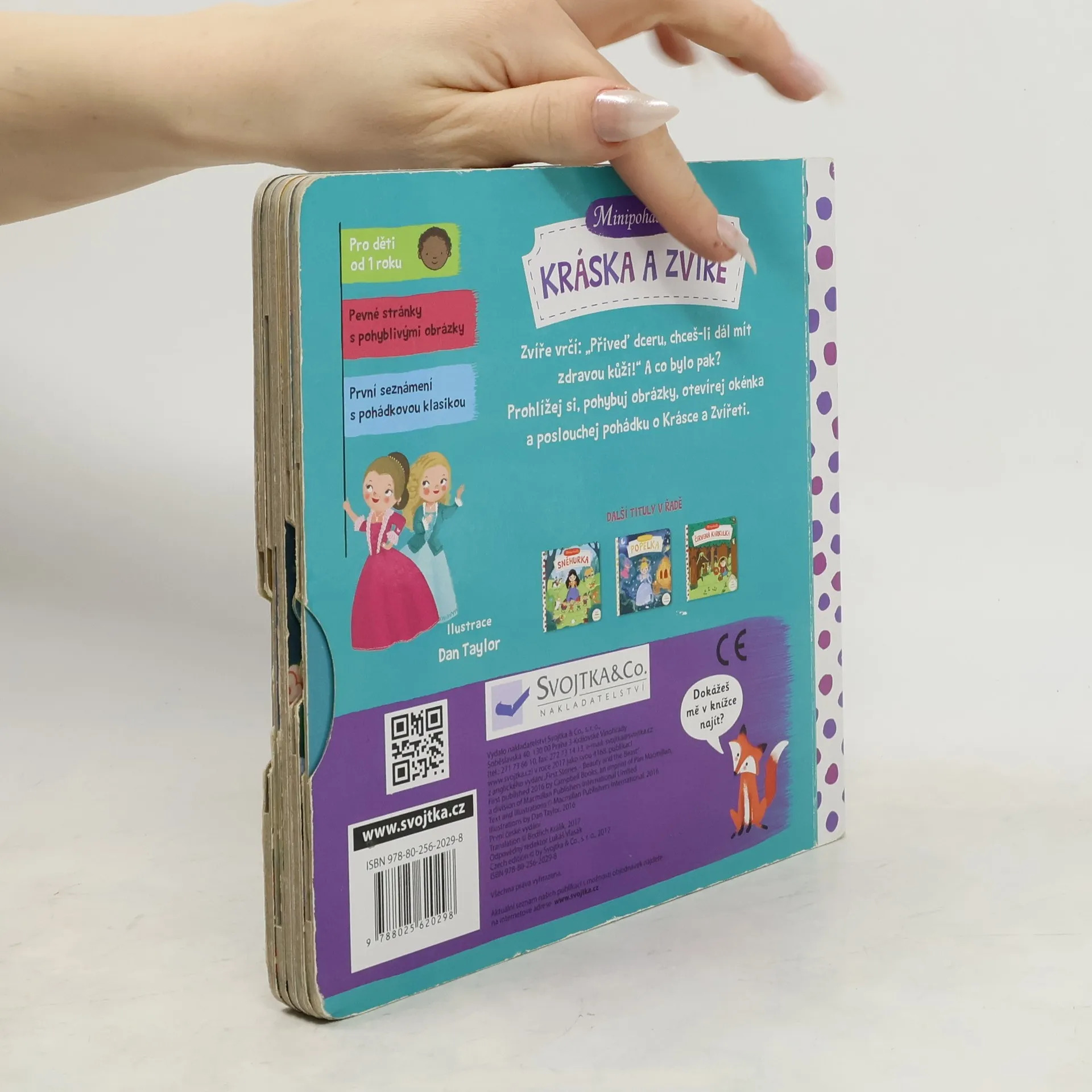 Tato veršovaná minipohádka je určena dětem od jednoho roku. Má pevné stránky s pohyblivými prvky, takže si děti mohou příběh oživit a procvičit si prstíky. Toto malé dětské pohádkové leporelo s pevnými stránkami a pohyblivými obrázky je určeno dětem od jednoho roku a najdete v něm krátkou veršovanou pohádku Kráska a zvíře. Při jejím poslouchání si děti mohou procvičovat svou jemnou motoriku a zároveň si pohádkový příběh oživit.Tak vzhůru do čtení! Minipohádka Kráska a zvíře už na vás čeká!