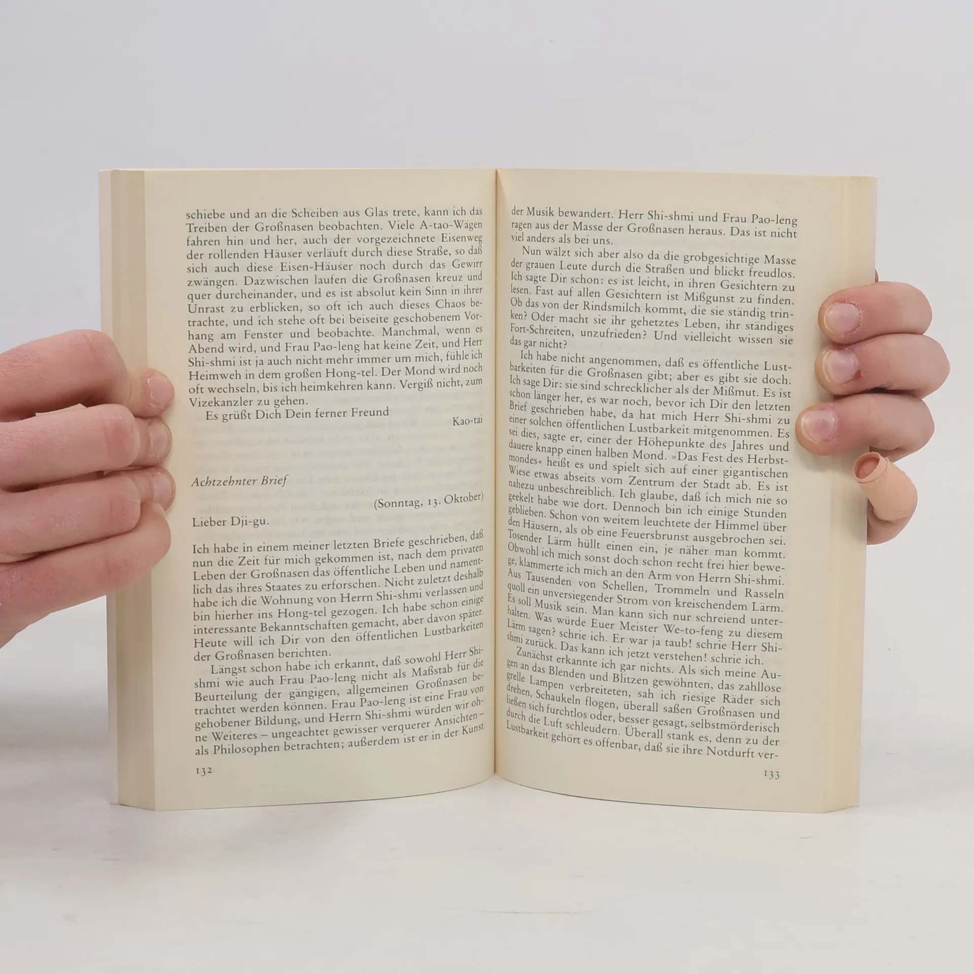 Ein Mandarin aus dem China des 10. Jahrhunderts versetzt sich mit Hilfe eines »Zeit-Reise-Kompasses« in die heutige Zeit. Er überspringt nicht nur tausend Jahre, sondern landet auch in einem völlig anderen Kulturkreis: in einer modernen Großstadt, deren Name in seinen Ohren wie Min-chen klingt und die in Ba Yan liegt. Verwirrt und wißbegierig stürzt sich Kao-tai in ein Abenteuer, von dem er nicht weiß, wie es ausgehen wird. In Briefen an seinen Freund im Reich der Mitte schildert er seine Erlebnisse und Eindrücke, erzählt vom seltsamen Leben der »Großnasen«, von ihren kulturellen und technischen Errungenschaften und versucht Beobachtungen und Vorgänge zu interpretieren, die ihm selbst zunächst unverständlich sind.