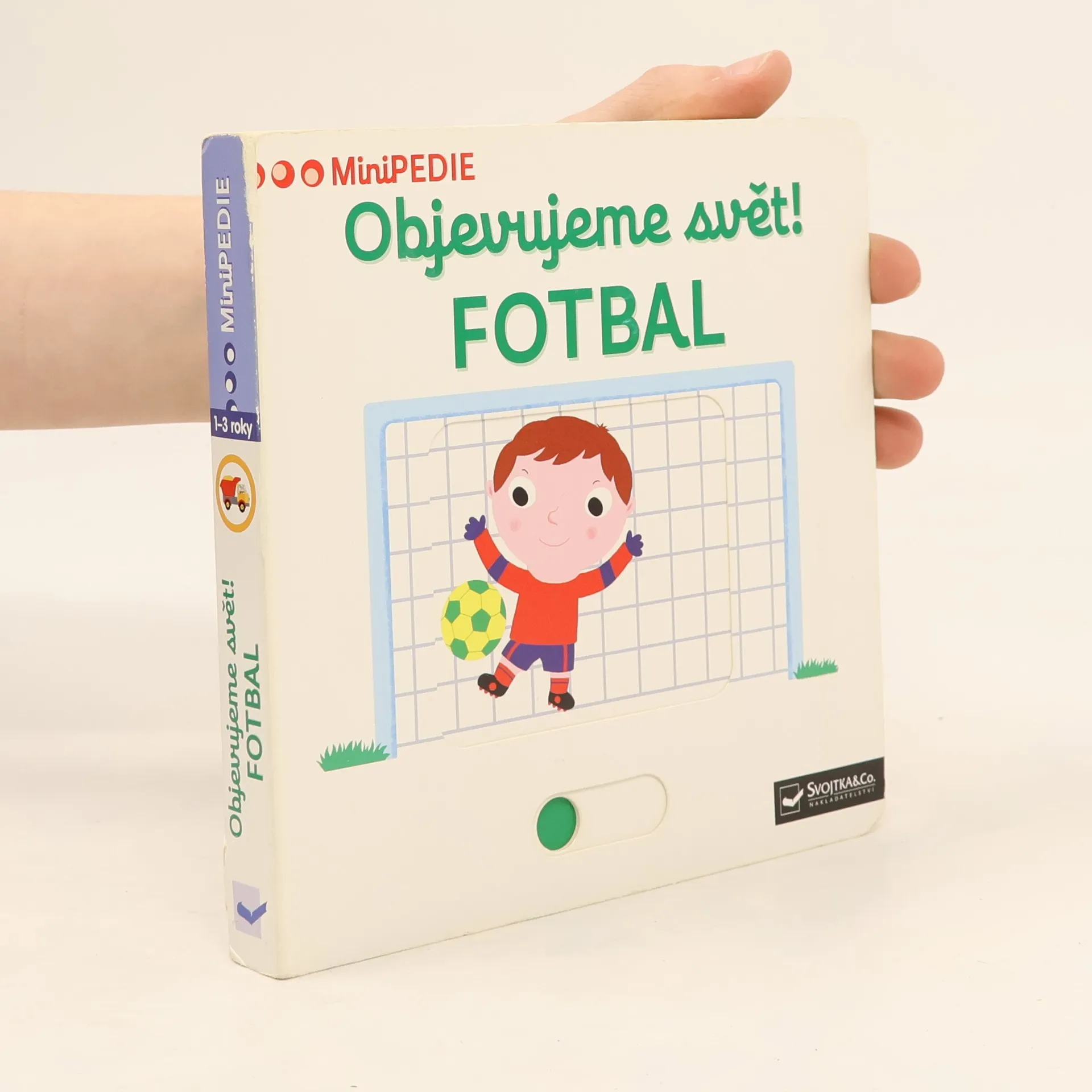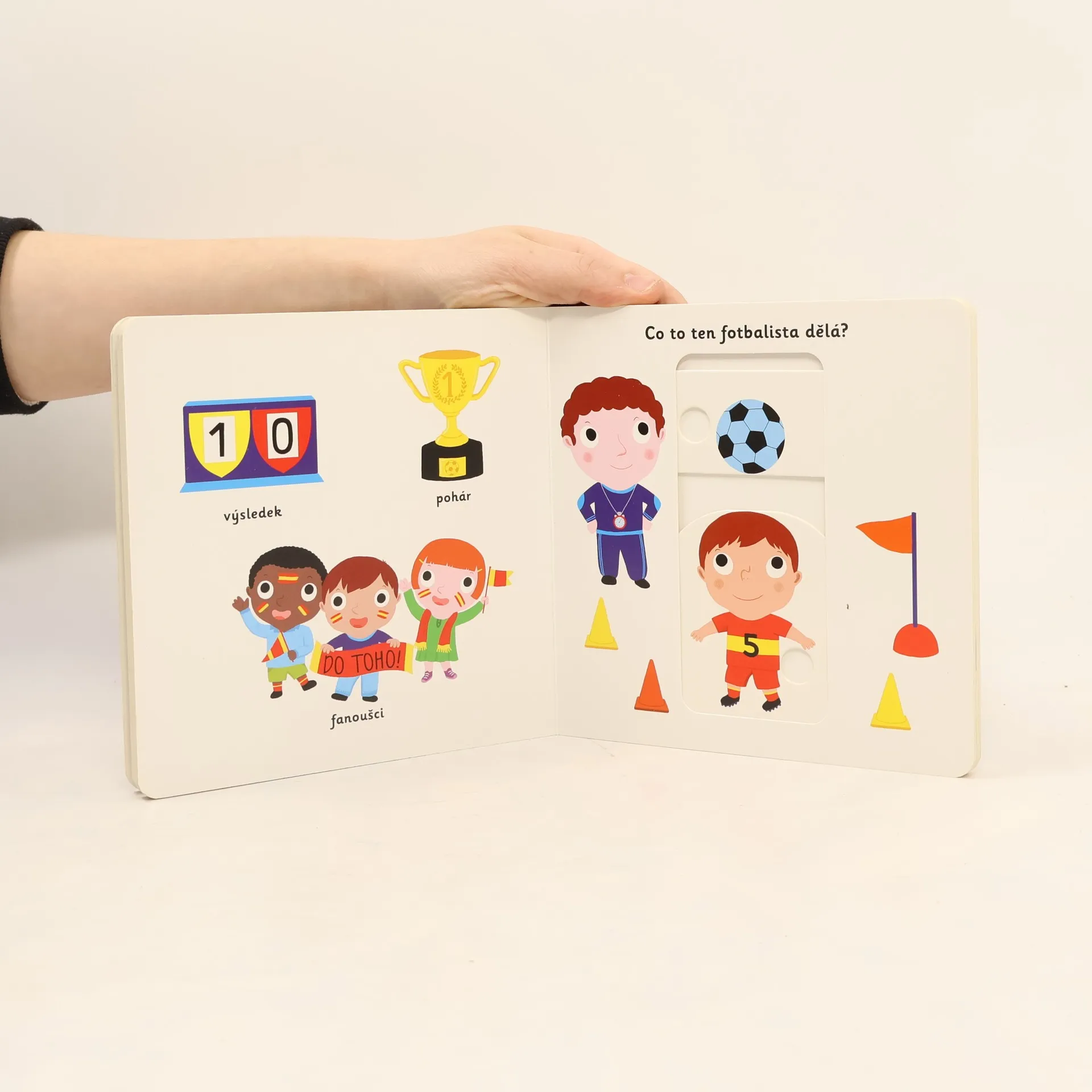 Navštiv fotbalové utkání a nauč se pojmenovat vše, co můžeš na fotbale vidět! Leporelo pro nejmenší děti s posuvnými prvky a pestrými ilustracemi. S čím se hraje fotbal? Co má během utkání na starost rozhodčí? Co to znamená, když fotbalista dělá "hlavičky"? A jak se nakonec rozhodne o vítězi? Pojmenuje vše, co můžeš vidět na fotbalovém zápase, a objevuj svět kolem sebe. Knížka pro ty nejmenší fotbalové fanoušky! Pestrobarevné ilustrace a posuvné prvky v tomto leporelu rozšiřují dětskou slovní zásobu zábavnou formou. Pohyblivé elementy v této knize rozvíjí jemnou motoriku dítěte a přispívají k živosti ilustrací. Knížka s prvky Montessori.