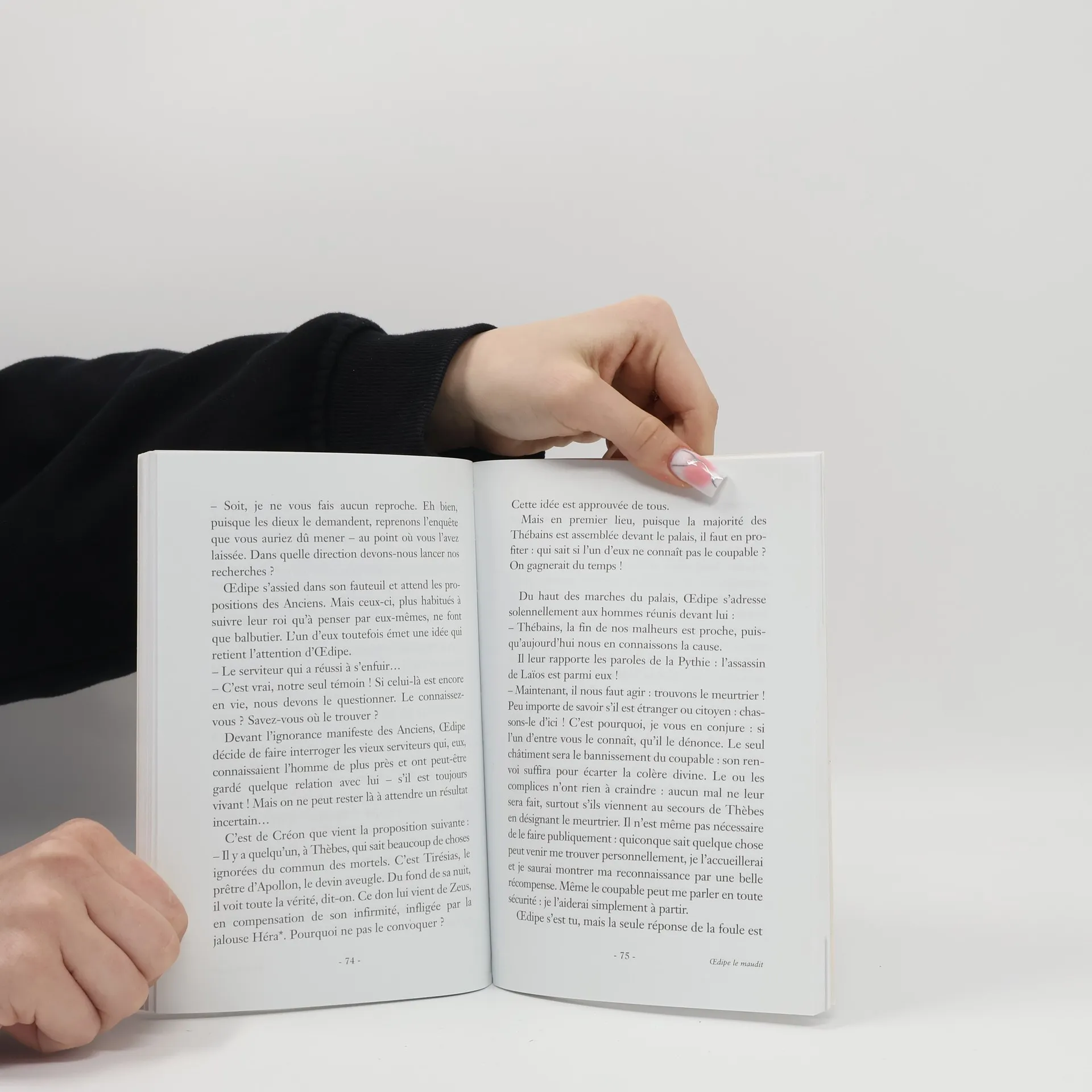 Oedipe a juste le temps d'entrevoir dans l'ombre le visage enfantin, crispé par l'effroi, d'une toute jeune fille, quand un bruit fracassant lui fait lever la tête. Il entend à peine la jeune fille refermer la porte en sanglotant. Assis maintenant face à lui, devant la muraille, un monstre venu du ciel replie tranquillement ses ailes immenses, eu fixant Oedipe avec un sourire ironique.