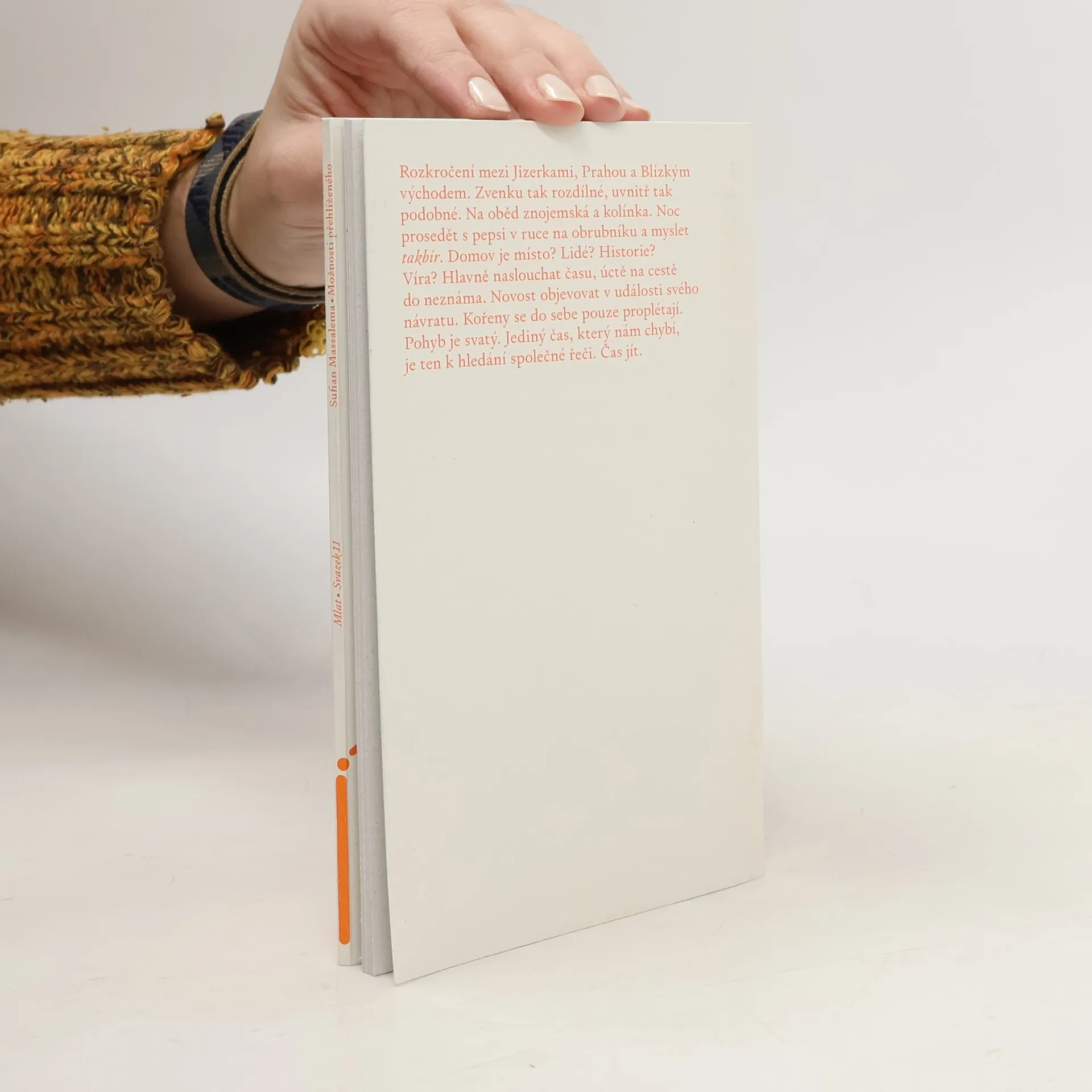 Rozkročení mezi Jizerkami, Prahou a Blízkym vychodem. Zvenku tak rozdílné, uvnitř tak podobné. Na oběd znojemská a kolínka. Noc prosedět s pepsi v ruce na obrubníku a myslet takbir. Domov je místo? Lidé? Historie? Víra? Hlavně naslouchat času, úctě na cestě do neznáma. Novost objevovat v události svého návratu. Kořeny se do sebe pouze proplétají. Pohyb je svaty. Jediny čas, ktery nám chybí, je ten k hledání společné řeči. Čas jít.