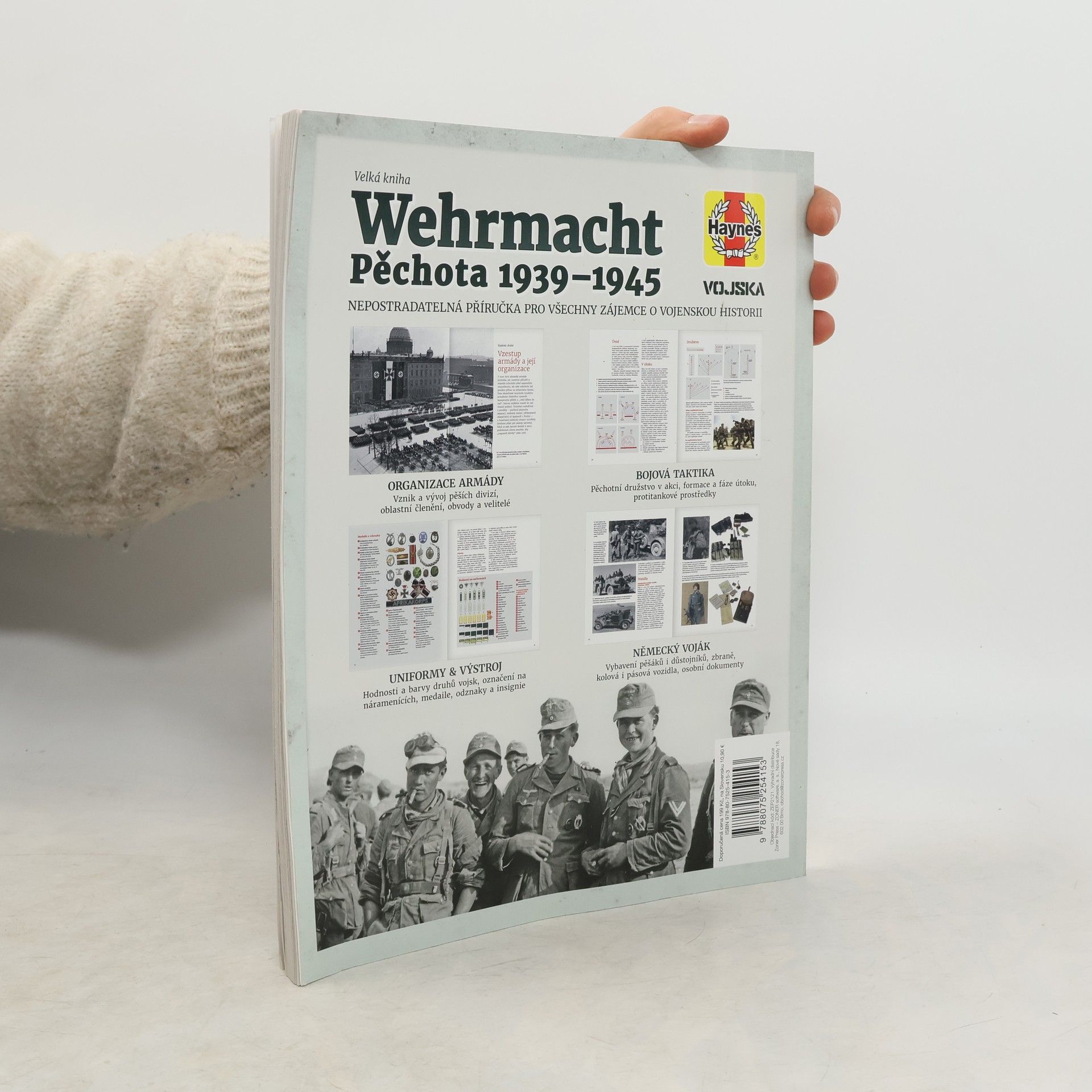 Organizace armády, vznik a vývoj pěších divizí, oblastní členění, obvody a velitelé. Bojová taktika, pěchotní družstvo v akci, formace a fáze útoku, protitankové prostředky. Uniformy a výstroj, hodnosti a barvy druhů vojsk, označení na náramenících, medaile, odznaky a insignie. V letech 1939 až 1945 sloužilo v německém pozemním vojsku bezmála 13 milionů mužů, kteří bojovali na rozsáhlém území Evropy a severní Afriky. Přísahali věrnost Adolfu Hitlerovi, přičemž více než čtyři miliony z nich padly a přes pět milionů bylo raněno. Po dobytí většiny Evropy v letech 1939–1941 se nacistický diktátor zaměřil na Sovětský svaz, kde však armáda přišla o svůj elitní výkvět. I po těchto porážkách se dokázala udržet až do roku 1945 díky kvalitnímu výcviku, indoktrinaci, obranné taktice a osobní statečnosti. Publikace nabízí vyčerpávající informace o vojácích, kteří v letech 1939–1945 bojovali za německé vítězství, mapuje jejich výcvik, organizaci, výzbroj, uniformy a bojovou taktiku. Text je doplněn stovkami fotografií a ilustrací, které poskytují fascinující pohled do života obyčejného německého pěšáka.
