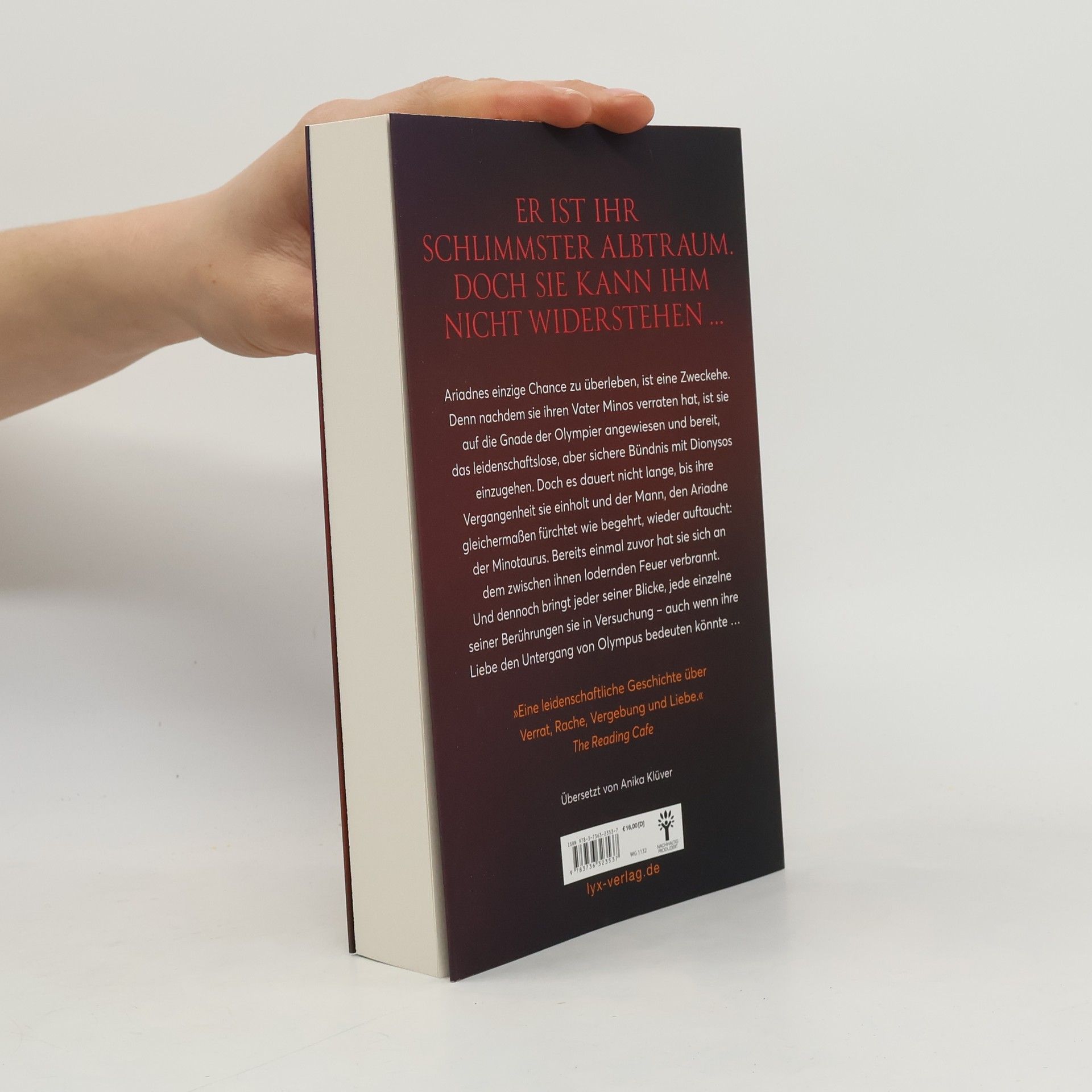 Ariadne muss eine Zweckehe mit Dionysus eingehen, um zu überleben, nachdem sie ihren Vater verraten hat. Doch als der Minotaurus, der ihre größte Angst und Versuchung verkörpert, zurückkehrt, wird sie von ihrer Vergangenheit eingeholt. Ihre verbotene Liebe könnte Olympus bedrohen. Band 7 der DARK-OLYMPUS-Reihe von Katee Roberts.