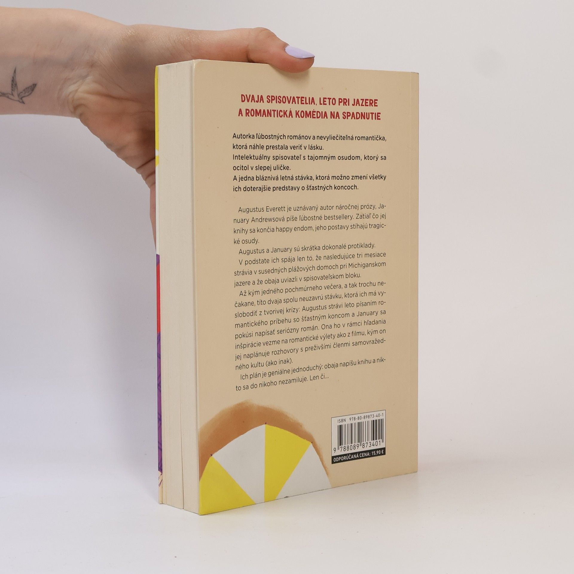 Autorka ľúbostných románov a nevyliečiteľná romantička, ktorá náhle prestala veriť v lásku. Renomovaný spisovateľ s tajomným osudom, ktorý sa ocitol v slepej uličke. A jedna bláznivá letná stávka, ktorá možno zmení všetky ich doterajšie predstavy o šťastných koncoch. Augustus Everett je uznávaný autor náročnejšej prózy, January Andrewsová píše ľúbostné bestsellery. Zatiaľ čo jej knihy sa končia happy endom, jeho postavy stíhajú tragické osudy. Augustus a January sú skrátka dokonalé protiklady. V podstate ich spája len to, že nasledujúce tri mesiace strávia v susedných plážových domoch pri Michiganskom jazere a že obaja uviazli v spisovateľskom bloku. Až kým jedného pochmúrneho večera a tak trochu nečakane títo dvaja spolu neuzavrú stávku, ktorá ich má vyslobodiť z tvorivej krízy: Augustus strávi leto písaním romantického príbehu so šťastným koncom a January sa pokúsi napísať seriózny román. Ona ho v rámci hľadania inšpirácie vezme na romantické výlety ako z filmu, kým on jej naplánuje rozhovory s preživšími členmi samovražedného kultu (ako inak). Ich plán je geniálne jednoduchý: obaja dopíšu knihu a nikto sa do nikoho nezamiluje. Len či...