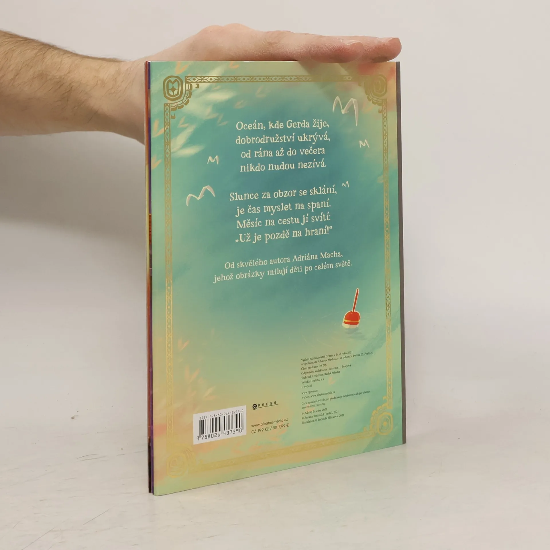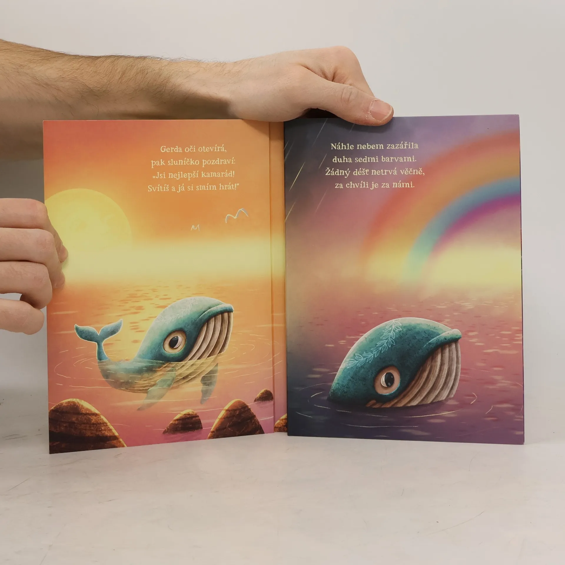 Vypluj s malou Gerdou do vod oceánu a prožij s ní celý den od úsvitu až po ulehnutí do postýlky. Budete společně skotačit ve vlnkách, seznámíte se s racky, tučňáky i narvaly a prožijete společně hravá dobrodružství i opravdovou mořskou bouři, po které ale vyjde přenádherná duha. A když přijde večer, stulíte se do bezpečí maminčiny náruče a společně odplujete do říše snů.