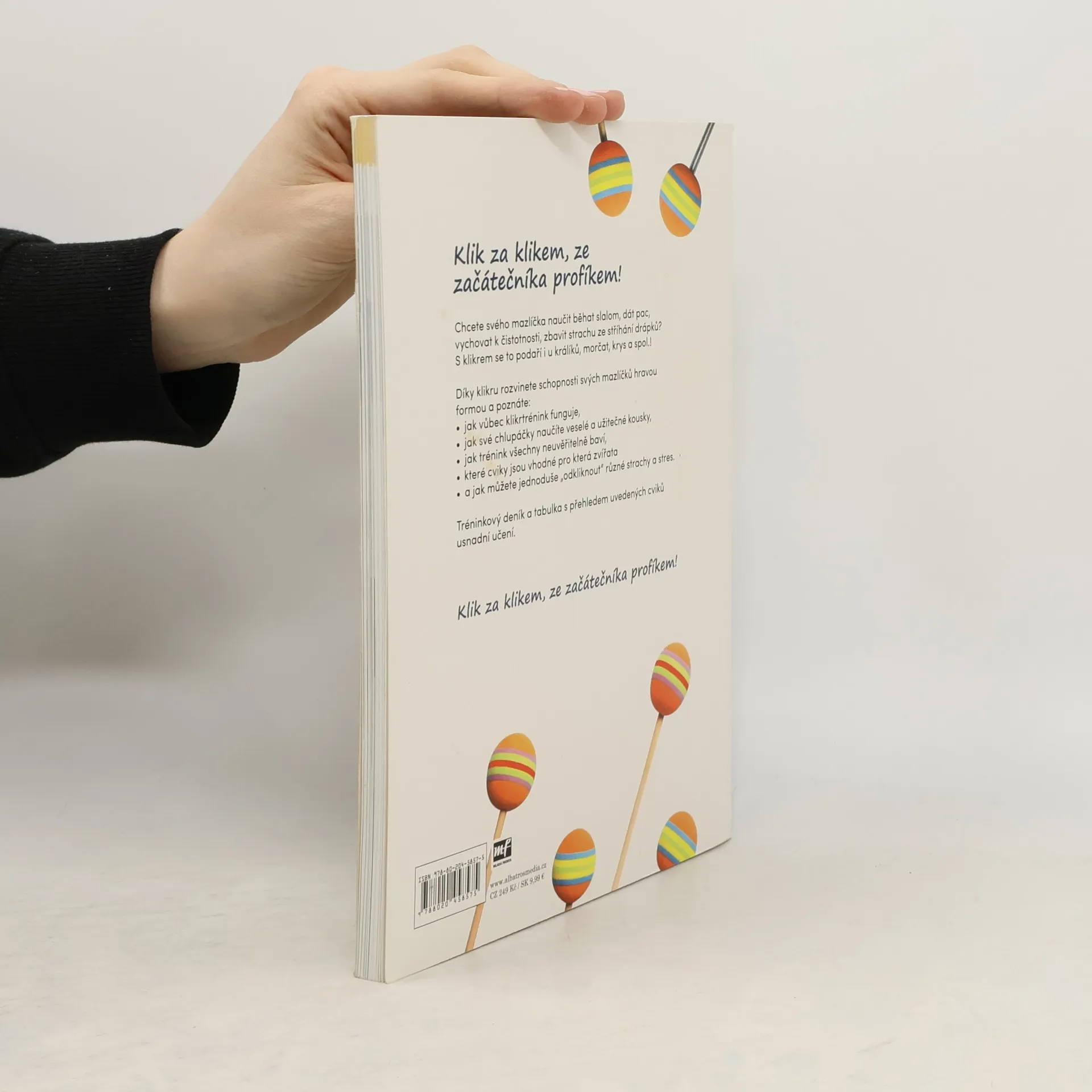 Chcete svého mazlíčka naučit běhat slalom, dát pac, vychovat k čistotnosti, zbavit strachu ze stříhání drápků? S klikrem se vám to podaří i u králíků, morčat, krys a spol.! Díky klikru rozvinete schopnosti svých mazlíčků hravou formou a poznáte: • jak vůbec klikrtrénink funguje, • jak své chlupáčky naučíte veselé a užitečné kousky, • jak trénink všechny neuvěřitelně baví, • které cviky jsou vhodné pro která zvířata • a jak můžete jednoduše „odkliknout“ různé strachy a stres.
