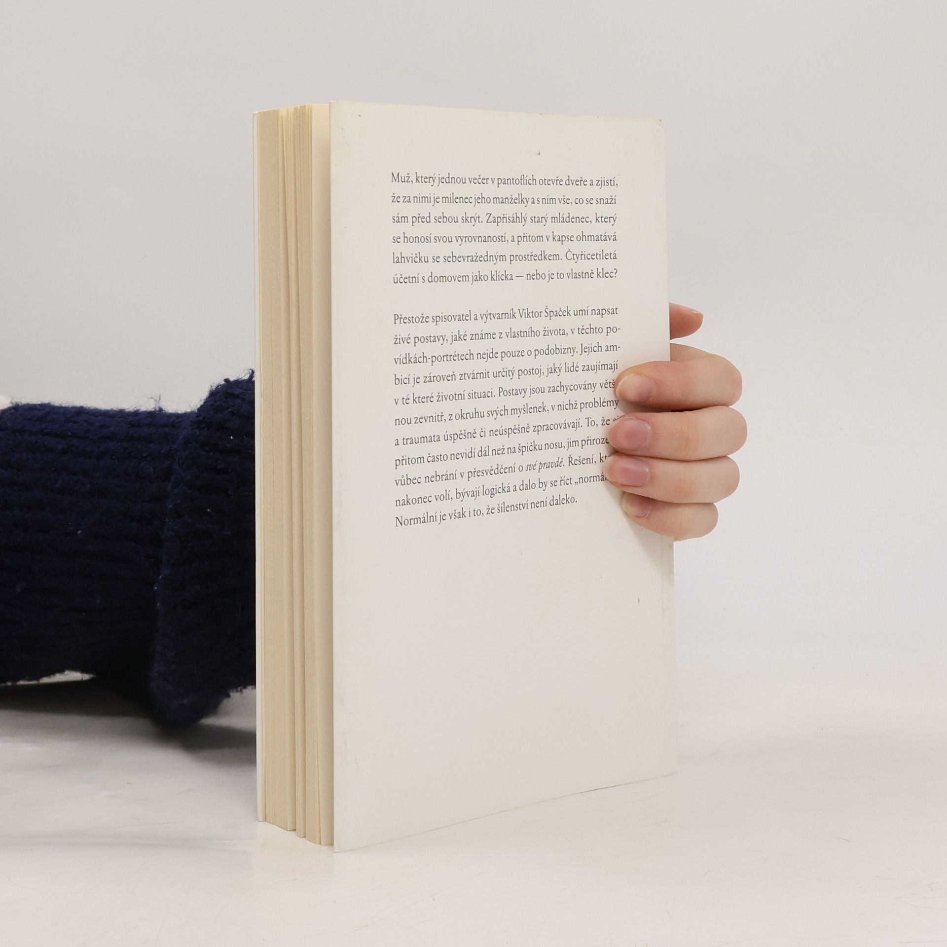 Muž, který jednou večer v pantoflích otevře dveře a zjistí, že za nimi je milenec jeho manželky a s ním vše, co se snaží sám před sebou skrýt. Zapřisáhlý starý mládenec, který se honosí svou vyrovnaností, a přitom v kapse ohmatává lahvičku se sebevražedným prostředkem. Čtyřicetiletá účetní s domovem jako klícka — nebo je to vlastně klec? Přestože Viktor Špaček umí napsat živé postavy, jaké známe z vlastního života, v těchto povídkách-portrétech nejde pouze o podobizny. Jejich ambicí je zároveň ztvárnit určitý postoj, jaký lidé zaujímají v té které životní situaci. Postavy jsou zachycovány většinou zevnitř, z okruhu jejich myšlenek, v nichž problémy a traumata úspěšně či neúspěšně zpracovávají. To, že si přitom často nevidí dál než na špičku nosu, jim přirozeně vůbec nebrání v přesvědčení o své pravdě. Řešení, která nakonec volí, bývají logická a dalo by se říct „normální“. Normální však je i to, že šílenství není daleko.