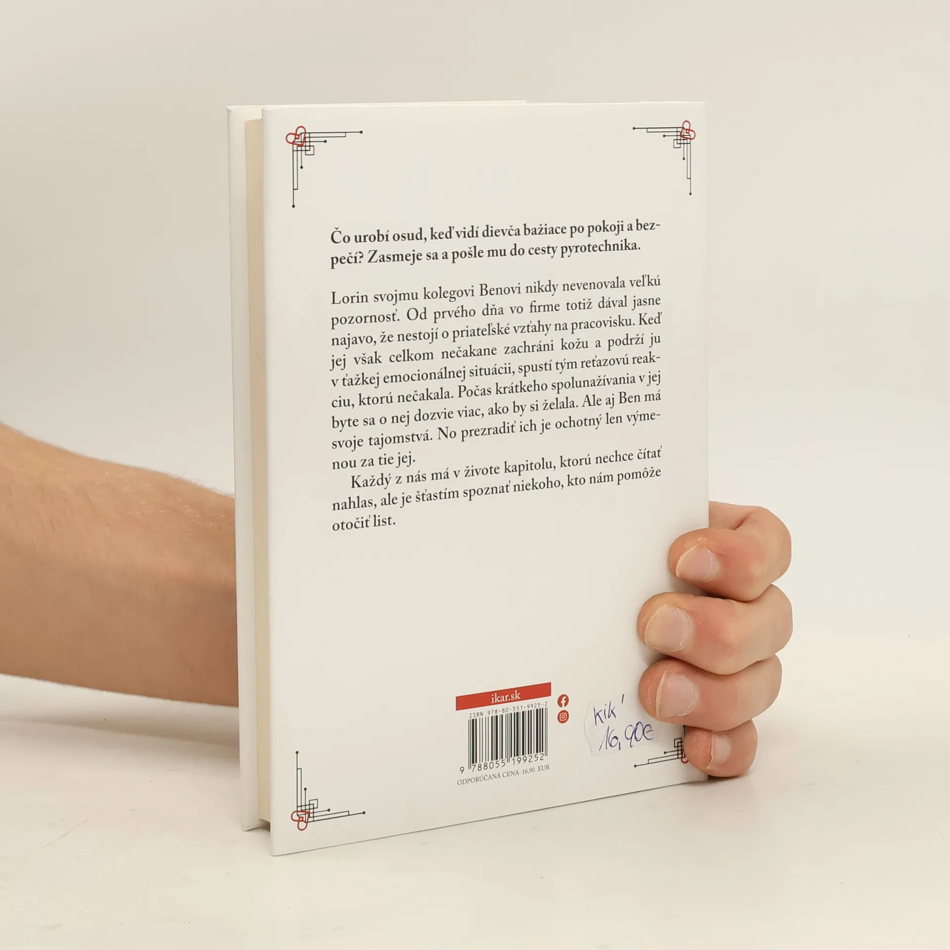 Čo urobí osud, keď vidí dievča bažiace po pokoji a bezpečí? Zasmeje sa a pošle jej do cesty pyrotechnika.Lorin svojmu kolegovi Benovi nikdy nevenovala veľkú pozornosť. Od prvého dňa v ich firme totiž dával jasne najavo, že o priateľské kontakty nestojí. Keď jej celkom nečakane zachráni kožu a podrží ju v ťažkej emocionálnej situácii, spustí tým reťazovú reakciu, ktorú nečakala. Počas krátkeho pobytu v jej byte sa o nej dozvie viac, ako chcela, aby vedel ktorýkoľvek z kolegov. Ale aj Ben má svoje tajomstvá. Prezradiť ich je však ochotný iba výmenou za tie jej.Každý z nás má v živote kapitolu, ktorú nechce čítať nahlas, ale je šťastím spoznať niekoho, kto nám pomôže otočiť stranu.