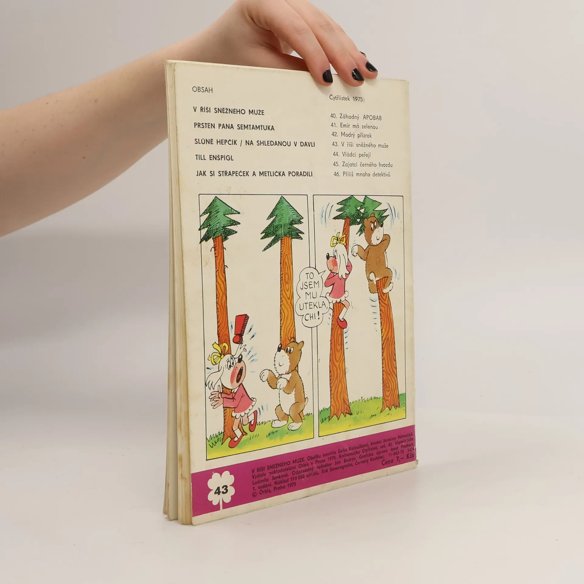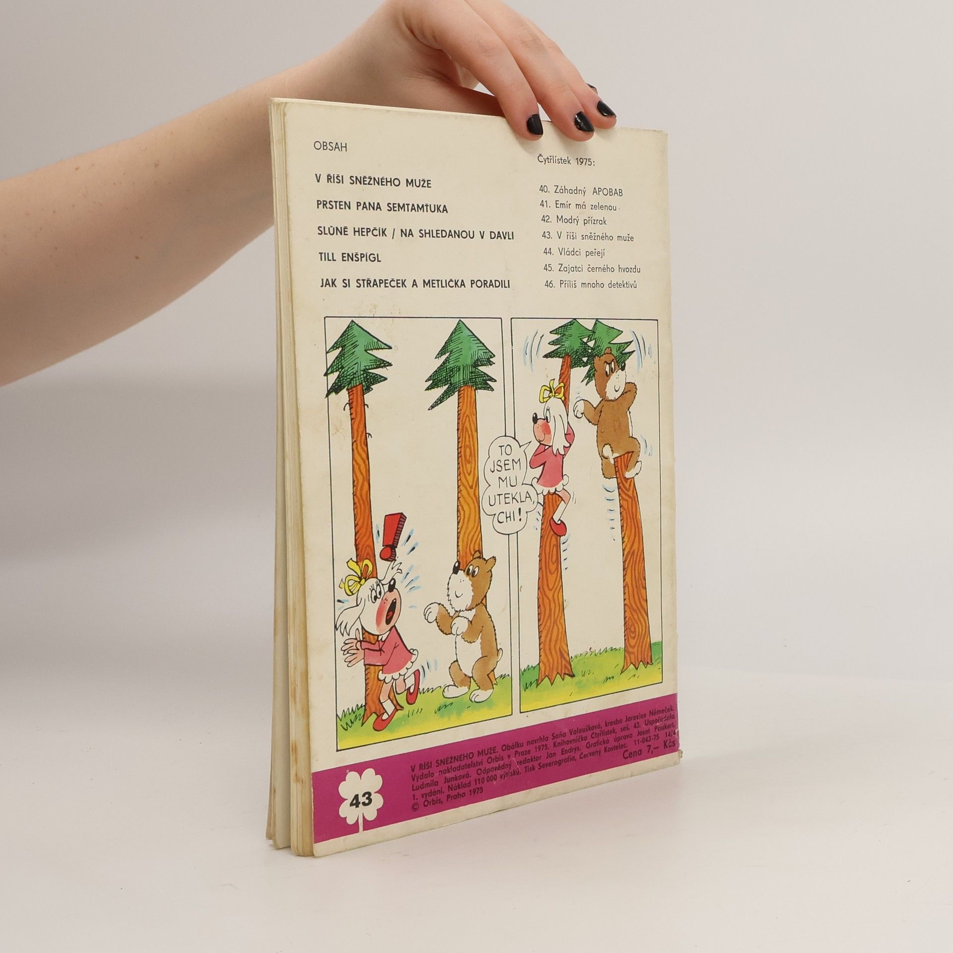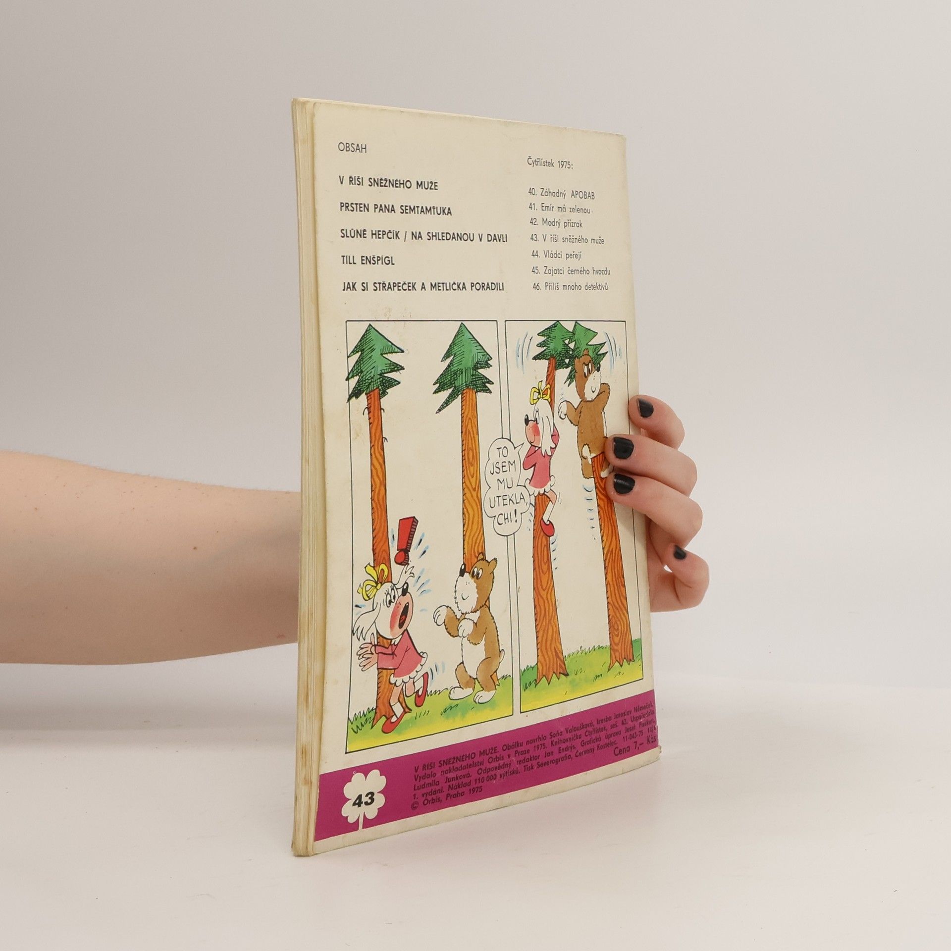 43. díl série. V říši sněžného muže - Ljuba Štíplová, Jaroslav Němeček. Prsten pana Semtamťuka - Svatopluk Hrnčíř, Adolf Born. Slůně Hepčík - Na shledanou v Davli - Petr Karmín, Rudolf Němec. Till Enšpígl - Charles de Coster, Jan Matěják. Jak si Střapeček a Metlička poradili - Bronislav Liberda.
