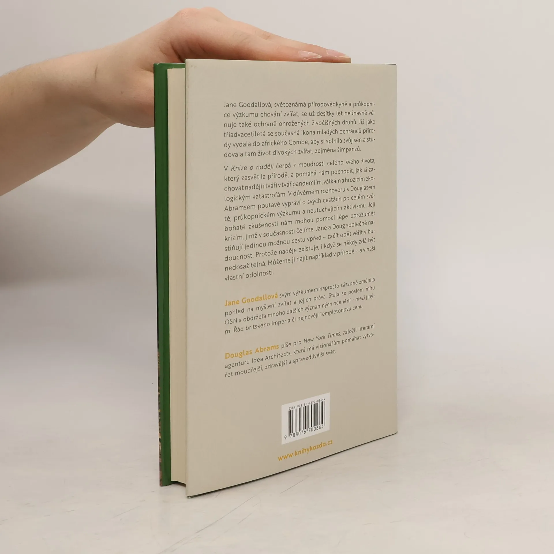 V Knize o naději čerpá Jane Goodallová z moudrosti celého svého života, který zasvětila přírodě, a pomáhá nám pochopit, jak si zachovat naději i tváří v tvář pandemiím, válkám a hrozícím ekologickým katastrofám. V důvěrném rozhovoru s Douglasem Abramsem poutavě vypráví o svých cestách po celém světě, průkopnickém výzkumu a neutuchajícím aktivismu. Její bohaté zkušenosti nám mohou pomoci lépe porozumět krizím, jimž v současnosti čelíme. Jane a Doug společně nastiňují jedinou možnou cestu vpřed - začít opět věřit v budoucnost. Protože naděje existuje, i když se někdy zdá být nedosažitelná. Můžeme ji najít například v přírodě - a v naší vlastní odolnosti.