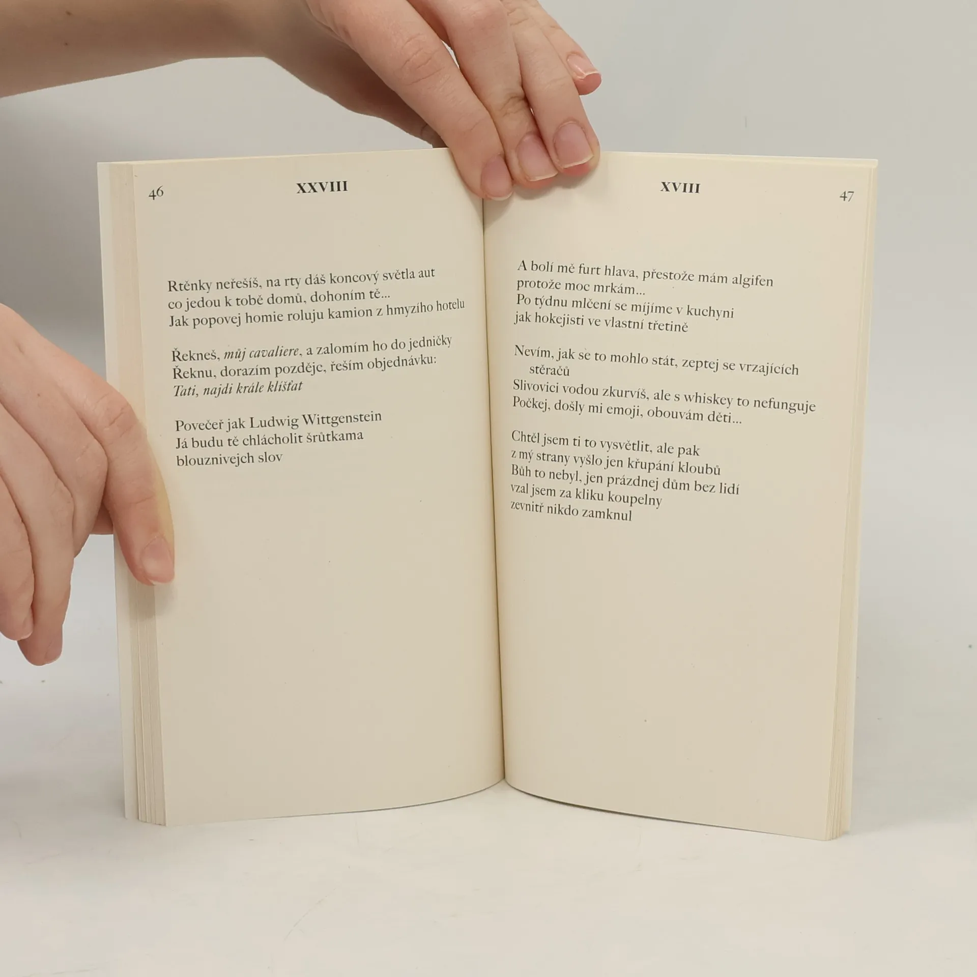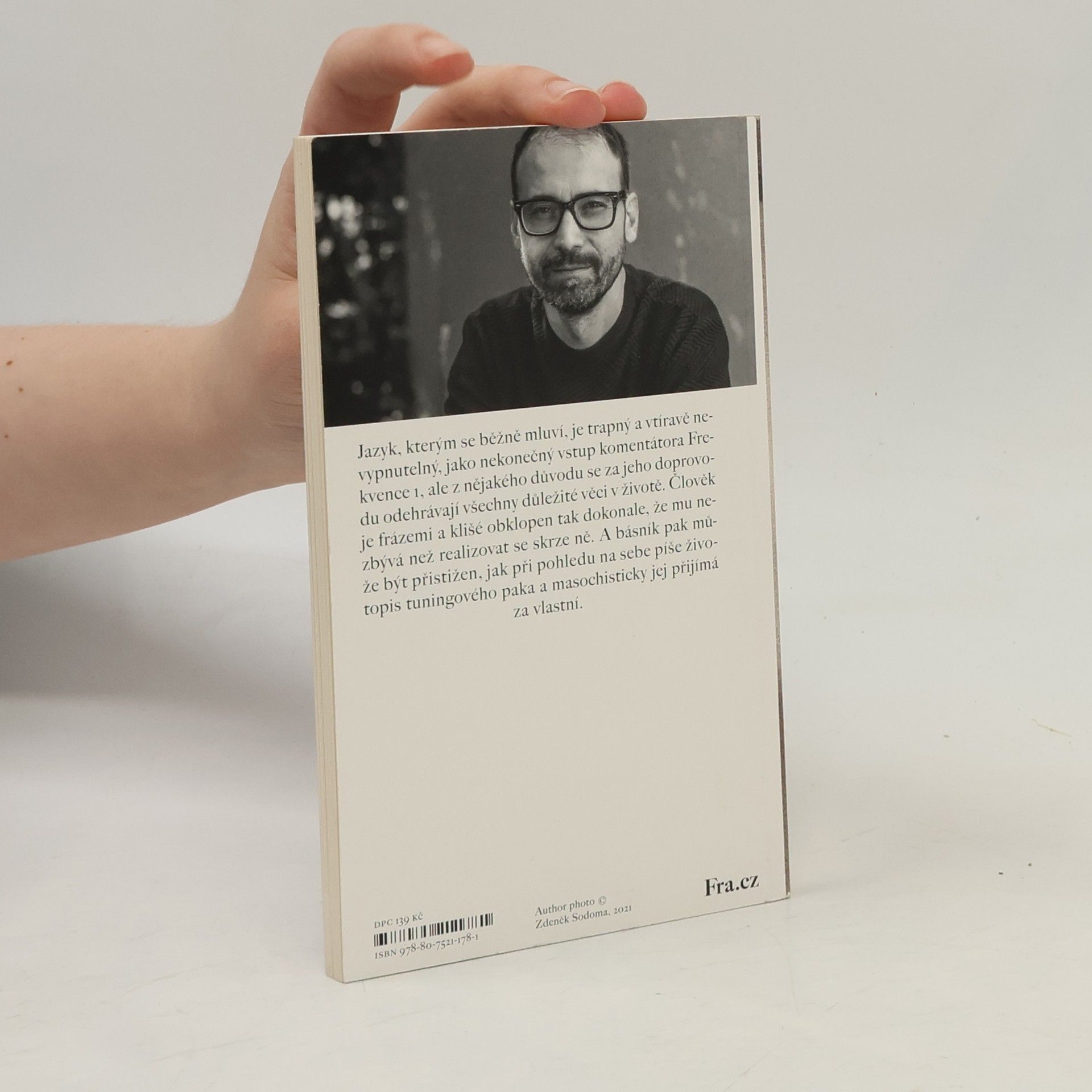 Jazyk, kterým se běžně mluví, je trapný a vtíravě nevypnutelný, jako nekonečný vstup komentátora Frekvence 1, ale z nějakého důvodu se za jeho doprovodu odehrávají všechny důležité věci v životě. Člověk je frázemi a klišé obklopen tak dokonale, že mu nezbývá než realizovat se skrze ně. A básník pak může být přistižen, jak při pohledu na sebe píše životopis tuningového paka a masochisticky jej přijímá za vlastní.
