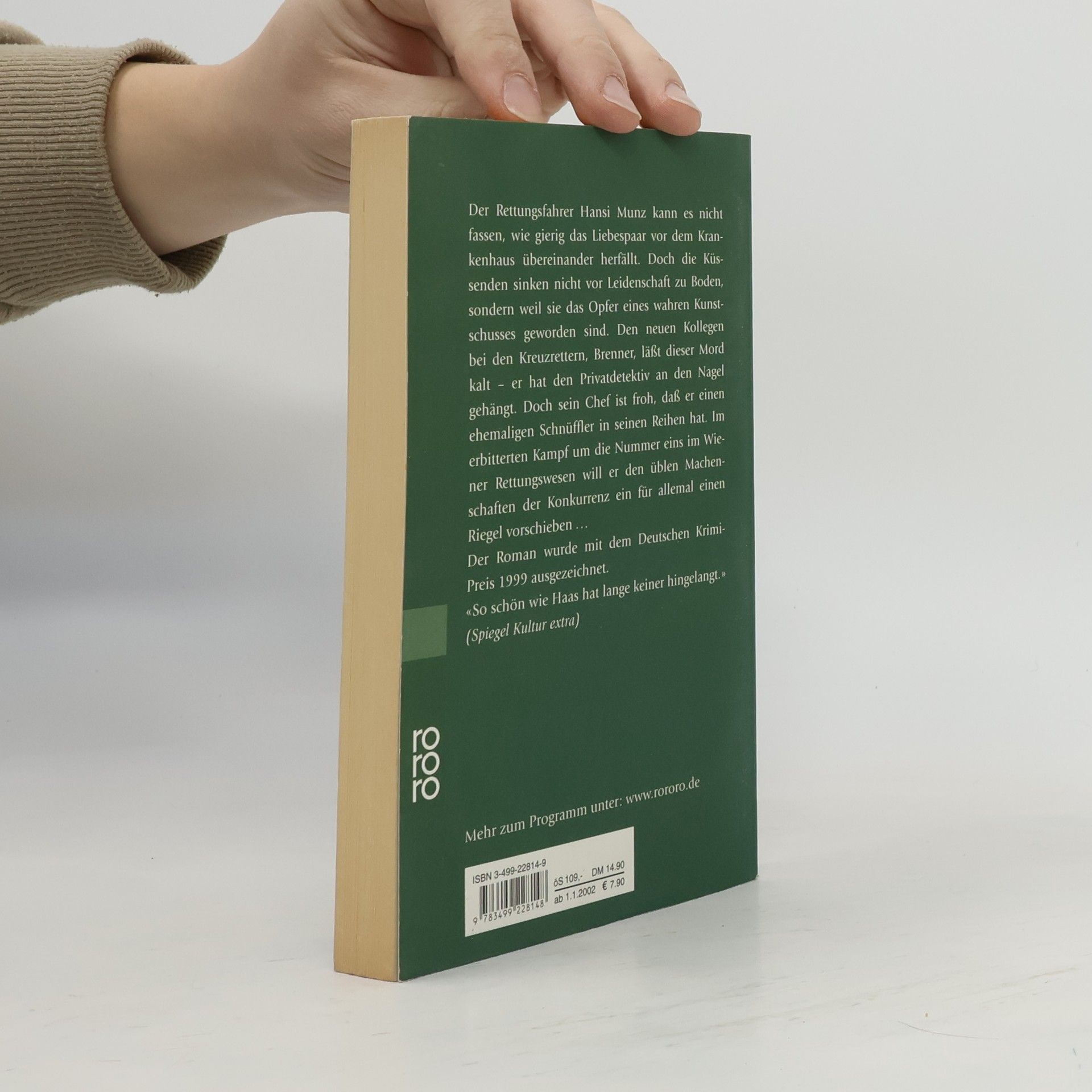 Der Rettungsfahrer Hansi Munz kann es nicht fassen, wie gierig das Liebespaar vor dem Krankenhaus übereinander herfällt. Doch die Küssenden sinken nicht vor Leidenschaft zu Boden, sondern weil sie Opfer eines wahren Kunstschusses geworden sind. Den neuen Kollegen bei den Kreuzrettern, Brenner, läßt dieser Mord kalt - er hat den Privatdetektiv an den Nagel gehängt. Doch sein Chef ist froh, dass er einen ehemaligen Schnüffler in seinen Reihen hat. Im erbitterten Kampf um die Nummer eins im Wiener Rettungswesen will er den üblen Machenschaften der Konkurrenz ein für allemal einen Riegel vorschieben... Der Roman wurde mit dem Deutschen Krimipreis 1999 ausgezeichnet.