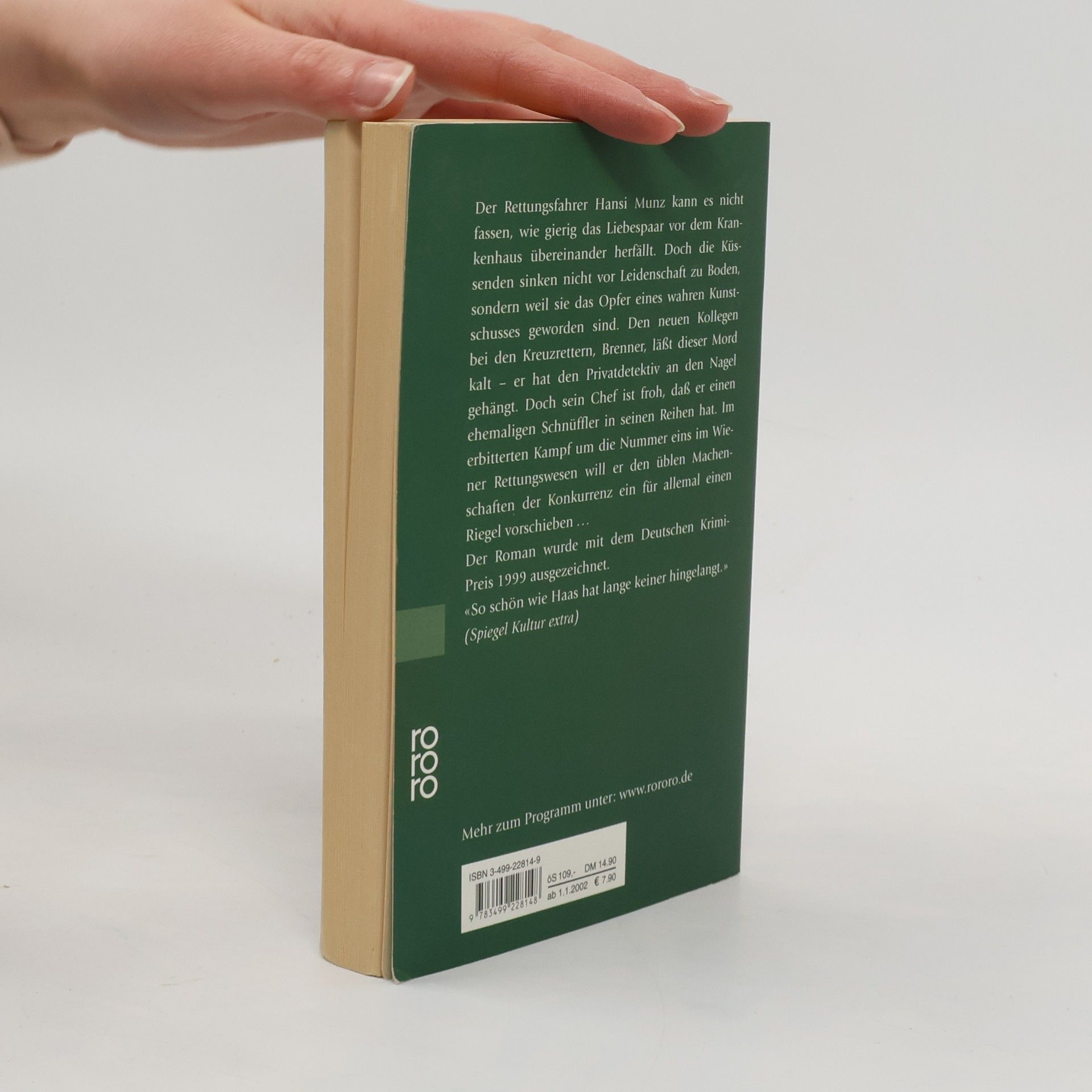 Der Rettungsfahrer Hansi Munz kann es nicht fassen, wie gierig das Liebespaar vor dem Krankenhaus übereinander herfällt. Doch die Küssenden sinken nicht vor Leidenschaft zu Boden, sondern weil sie Opfer eines wahren Kunstschusses geworden sind. Den neuen Kollegen bei den Kreuzrettern, Brenner, läßt dieser Mord kalt - er hat den Privatdetektiv an den Nagel gehängt. Doch sein Chef ist froh, dass er einen ehemaligen Schnüffler in seinen Reihen hat. Im erbitterten Kampf um die Nummer eins im Wiener Rettungswesen will er den üblen Machenschaften der Konkurrenz ein für allemal einen Riegel vorschieben... Der Roman wurde mit dem Deutschen Krimipreis 1999 ausgezeichnet.