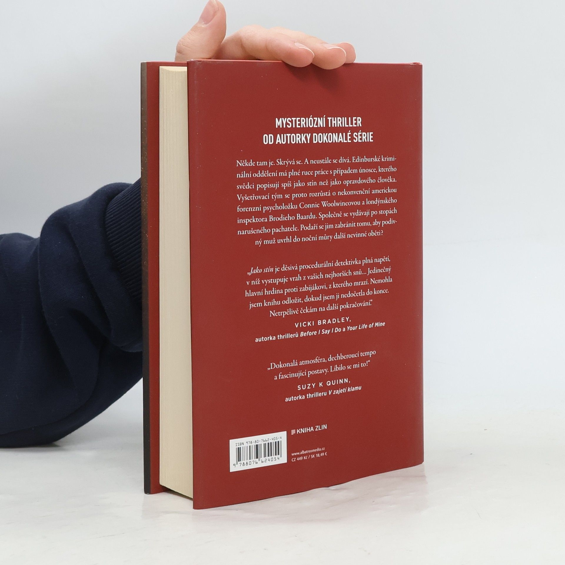 Mysteriózní thriller od autorky Dokonalé série Někde tam je. Skrývá se. A neustále se dívá. Edinburské kriminální oddělení má plné ruce práce s případem únosce, kterého svědci popisují spíš jako stín než jako opravdového člověka. Vyšetřovací tým se proto rozrůstá o nekonvenční americkou forenzní psycholožku Connie Woolwineovou a londýnského inspektora Brodieho Baardu. Společně se vydávají po stopách narušeného pachatele. Podaří se jim zabránit tomu, aby podivný muž uvrhl do noční můry další nevinné oběti?„Jako stín je děsivá procedurální detektivka plná napětí, v níž vystupuje vrah z vašich nejhorších snů… Jedinečný hlavní hrdina proti zabijákovi, z kterého mrazí. Nemohla jsem knihu odložit, dokud jsem ji nedočetla do konce. Netrpělivě čekám na další pokračování.“Vicki Bradley, autorka thrillerů Before I Say I Do a Your Life of Mine„Dokonalá atmosféra, dechberoucí tempo a fascinující postavy. Líbilo se mi to!“Suzy K Quinn, autorka thrilleru V zajetí klamu