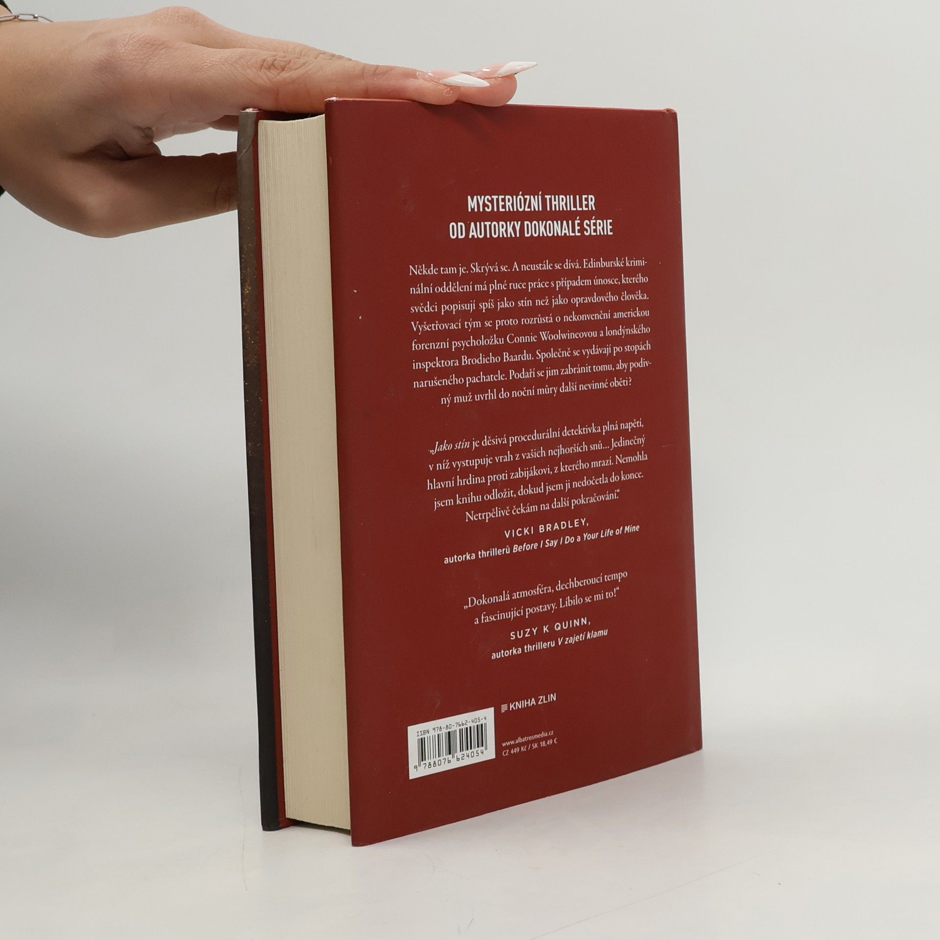 Mysteriózní thriller od autorky Dokonalé série Někde tam je. Skrývá se. A neustále se dívá. Edinburské kriminální oddělení má plné ruce práce s případem únosce, kterého svědci popisují spíš jako stín než jako opravdového člověka. Vyšetřovací tým se proto rozrůstá o nekonvenční americkou forenzní psycholožku Connie Woolwineovou a londýnského inspektora Brodieho Baardu. Společně se vydávají po stopách narušeného pachatele. Podaří se jim zabránit tomu, aby podivný muž uvrhl do noční můry další nevinné oběti?„Jako stín je děsivá procedurální detektivka plná napětí, v níž vystupuje vrah z vašich nejhorších snů… Jedinečný hlavní hrdina proti zabijákovi, z kterého mrazí. Nemohla jsem knihu odložit, dokud jsem ji nedočetla do konce. Netrpělivě čekám na další pokračování.“Vicki Bradley, autorka thrillerů Before I Say I Do a Your Life of Mine„Dokonalá atmosféra, dechberoucí tempo a fascinující postavy. Líbilo se mi to!“Suzy K Quinn, autorka thrilleru V zajetí klamu