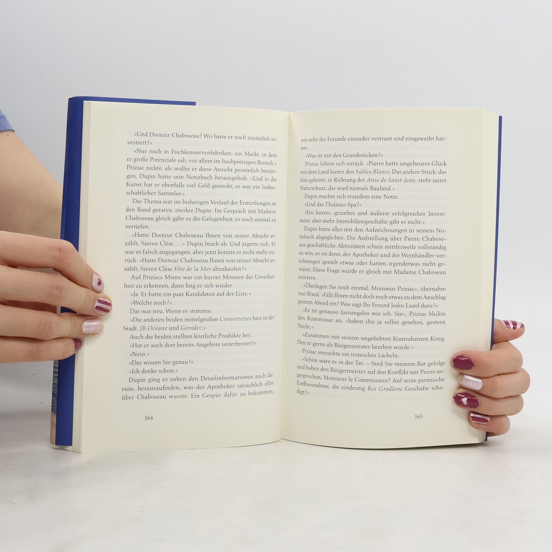 In der »blauen Stadt« Concarneau, kurz vor Pfingsten, feiert die Bevölkerung in der Altstadt Ville Close den Sommerbeginn mit Musik und Tanz. Doch die festliche Stimmung wird jäh gestört, als Kommissar Dupin vor seinem Lieblingsrestaurant, dem Amiral, einen Toten entdeckt. Zu allem Überfluss sind seine Inspektoren im Urlaub und Nolwenn ist unerreichbar. Zusammen mit zwei neuen Kolleginnen muss Dupin herausfinden, wer es auf Docteur Chaboseau, einen angesehenen Arzt aus einer einflussreichen Familie, abgesehen hatte. Weder seine Frau noch enge Freunde, ein Apotheker und ein Weinhändler, können sich einen Reim darauf machen. Könnten die Vorlieben des Arztes, der Kunstsammler war und in lokale Brauereien sowie Fischkonservenfabriken investierte, eine Rolle spielen? Während Dupin fieberhaft nach Hinweisen sucht, kommt es zu einem Anschlag, der die gesamte Stadt in Aufruhr versetzt. Spannend und stimmungsvoll wird Concarneau, mit seinen Häfen, Stränden, Galerien und Traditionen, zum lebendigen Protagonisten dieser Kriminalgeschichte, die die Besonderheiten der Stadt und ihrer Bewohner eindrucksvoll einfängt.