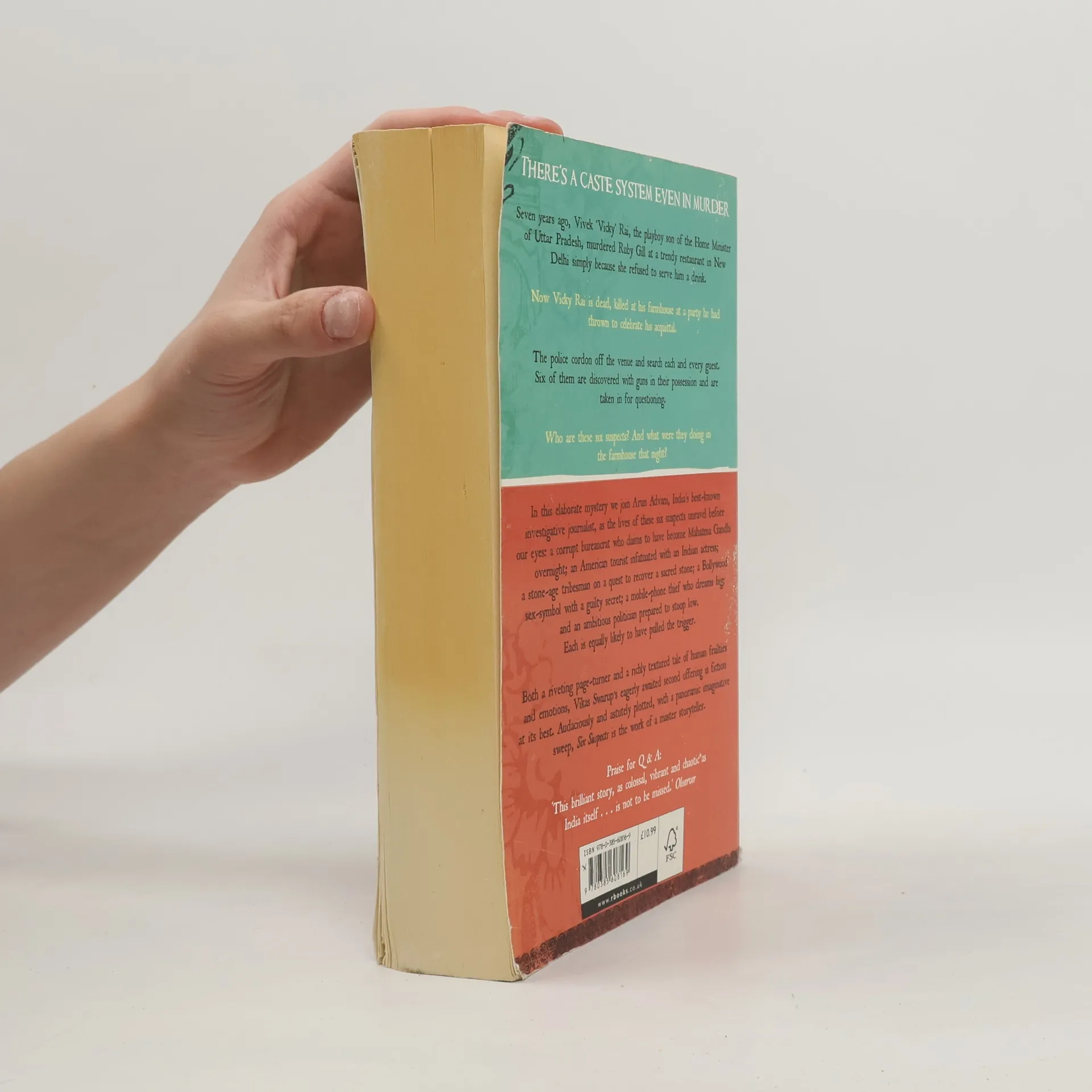 Seven years ago, Vivek 'Vicky' Rai, the playboy son of the Home Minister of Uttar Pradesh, murdered Ruby Gill at a trendy restaurant in New Delhi simply because she refused to serve him a drink. Now Vicky Rai is dead, killed at his farmhouse at a party he had thrown to celebrate his acquittal. The police search each and every guest. Six of them are discovered with guns in their possession and are taken in for questioning.' 'In this elaborate murder mystery we join Arun Advani, India's best-known investigative journalist, as the lives of these six suspects unravel before our eyes: a corrupt bureaucrat; an American tourist; a stone-age tribesman; a Bollywood sex symbol; a mobile phone thief; and an ambitious politician. Each is equally likely to have pulled the trigger.' 'Both a page turner and a richly textured tale of human frailties and emotions, Vikas Swarup's eagerly awaited second offering is astutely plotted, with a panoramic, imaginative sweep.