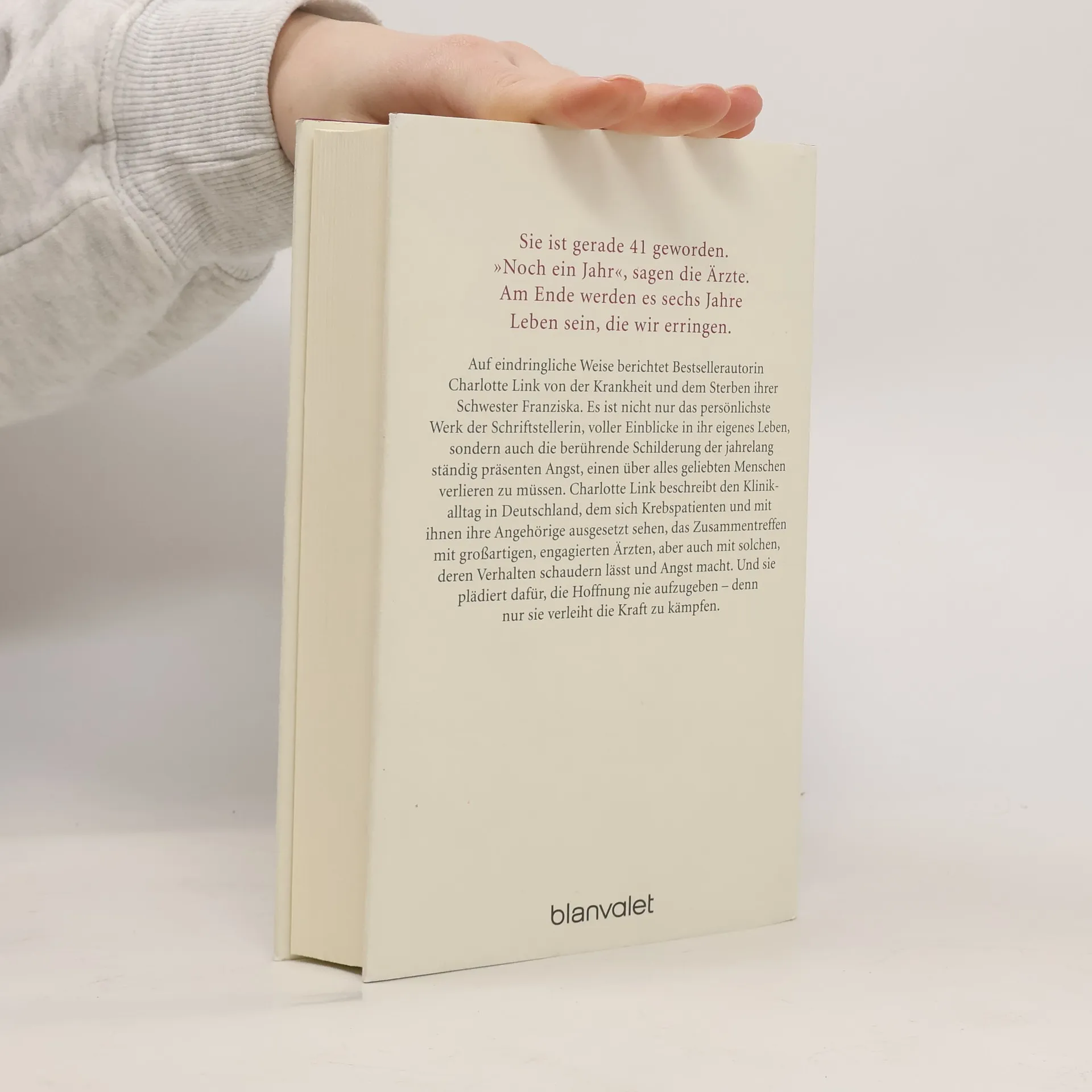 Das persönlichste Buch von Charlotte Link Auf eindringliche Weise berichtet Bestsellerautorin Charlotte Link von der Krankheit und dem Sterben ihrer Schwester Franziska. Es ist nicht nur das persönlichste Werk der Schriftstellerin, voller Einblicke in ihr eigenes Leben, sondern auch die berührende Schilderung der jahrelang ständig präsenten Angst, einen über alles geliebten Menschen verlieren zu müssen. Charlotte Link beschreibt den Klinikalltag in Deutschland, dem sich Krebspatienten und mit ihnen ihre Angehörigen ausgesetzt sehen, das Zusammentreffen mit großartigen, engagierten Ärzten, aber auch mit solchen, deren Verhalten schaudern lässt und Angst macht. Und sie plädiert dafür, die Hoffnung nie aufzugeben – denn nur sie verleiht die Kraft zu kämpfen. Ein subtiles, anrührendes Plädoyer für mehr Menschlichkeit. Ein Buch, das Kraft gibt, nicht aufzugeben und um das Leben zu kämpfen.
