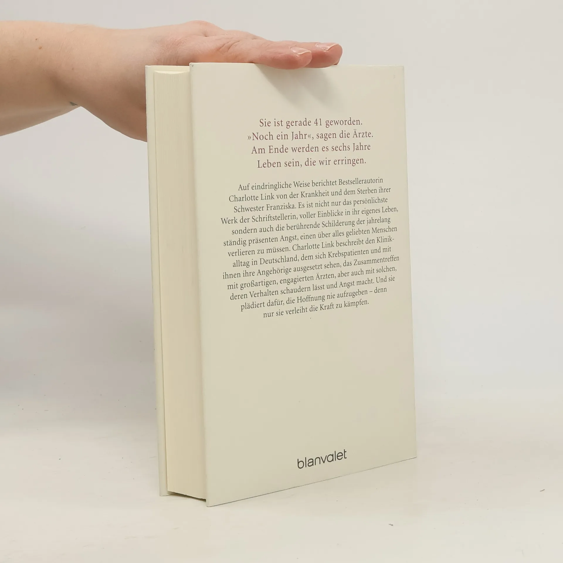 Das persönlichste Buch von Charlotte Link Auf eindringliche Weise berichtet Bestsellerautorin Charlotte Link von der Krankheit und dem Sterben ihrer Schwester Franziska. Es ist nicht nur das persönlichste Werk der Schriftstellerin, voller Einblicke in ihr eigenes Leben, sondern auch die berührende Schilderung der jahrelang ständig präsenten Angst, einen über alles geliebten Menschen verlieren zu müssen. Charlotte Link beschreibt den Klinikalltag in Deutschland, dem sich Krebspatienten und mit ihnen ihre Angehörigen ausgesetzt sehen, das Zusammentreffen mit großartigen, engagierten Ärzten, aber auch mit solchen, deren Verhalten schaudern lässt und Angst macht. Und sie plädiert dafür, die Hoffnung nie aufzugeben – denn nur sie verleiht die Kraft zu kämpfen. Ein subtiles, anrührendes Plädoyer für mehr Menschlichkeit. Ein Buch, das Kraft gibt, nicht aufzugeben und um das Leben zu kämpfen.
