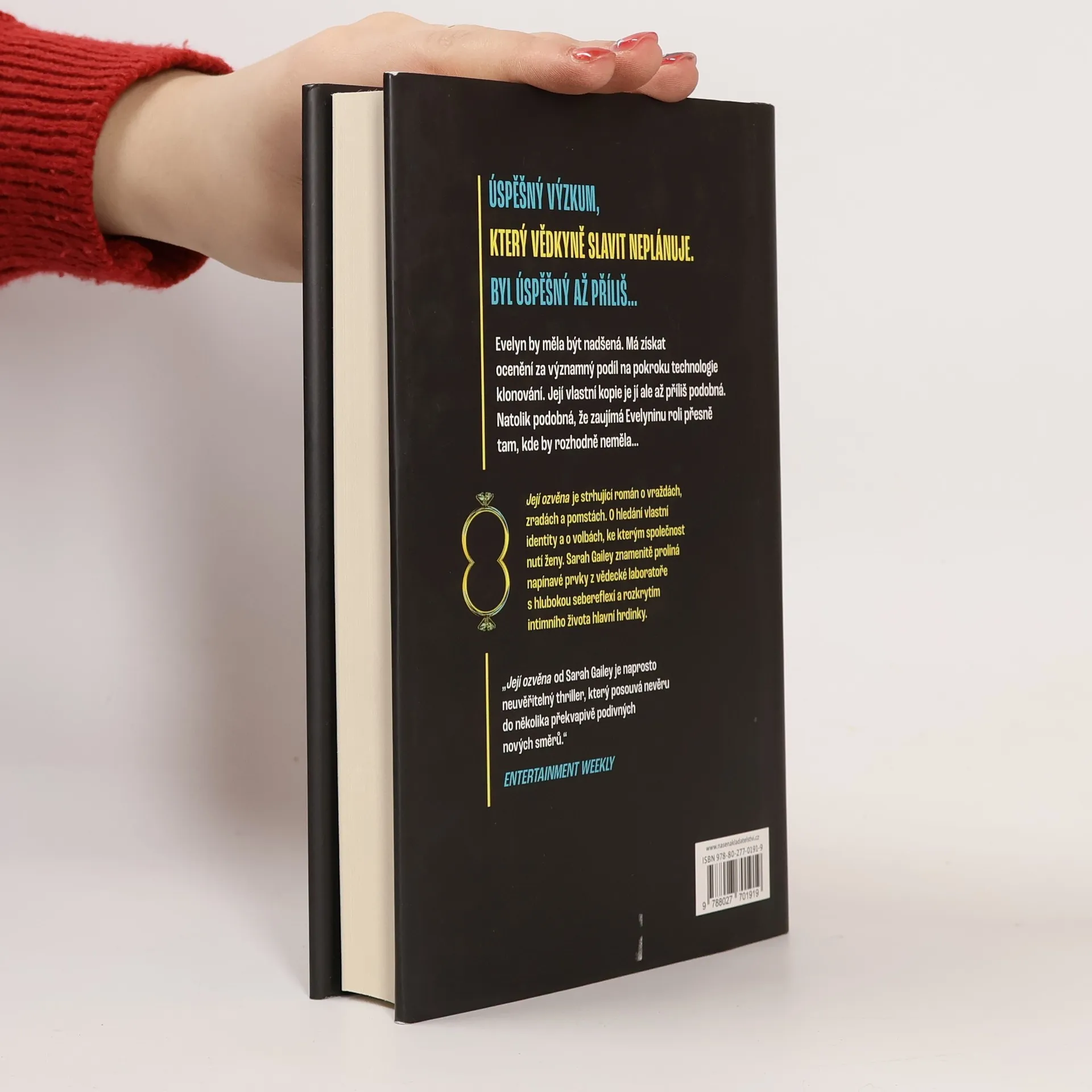 Ještě teď se stydím, že mi tak dlouho trvalo, než jsem to všechno pochopila. Bylo to nabíledni, měla jsem to přímo před nosem, ale trvalo mi tak dlouho, než mi došlo, koho jsem si vlastně vzala. Trvalo mi tak dlouho, než jsem ho začala nenávidět. Pro Evelyn Caldwellovou to měl být večer na počest jejího vědeckého bádání. Ocenění výzkumu klonování jí mělo pojistit kariéru, ale Evelyn má najednou jiné starosti. Její manžel Nathan ji opustil kvůli mladšímu, lepšímu a novějšímu modelu. Kvůli ženě, která je nyní těhotná, přestože to mělo být nemožné. A navíc je jí povědomá. Příliš povědomá na to, aby to byla náhoda. Je to žena, která nikdy neměla existovat. Martine, Evelynina kopie vytvořená na základě oceněného výzkumu klonů, je trpělivá, jemná a poslušná. Je vším, čím si vědkyně přísahala, že nikdy nebude. A má poměr s jejím manželem. Teď je ten nevěrný podrazák mrtvý a obě Caldwellovy manželky musí tuto nečekanou situaci řešit. Ještě že je Evelyn na špinavou práci zvyklá. Její ozvěna je strhující román o vraždách, zradách a pomstách. O hledání vlastní identity a o volbách, ke kterým společnost ženy nutí. Autorka poutavě prolíná napínavé prvky z vědecké laboratoře s hlubokou sebereflexí a sebepoznáním intimního života hlavní hrdinky. Kontroverzní i eticky aktuální téma zaujalo natolik, že se objeví na filmovém plátně dílem Annapurna Pictures.