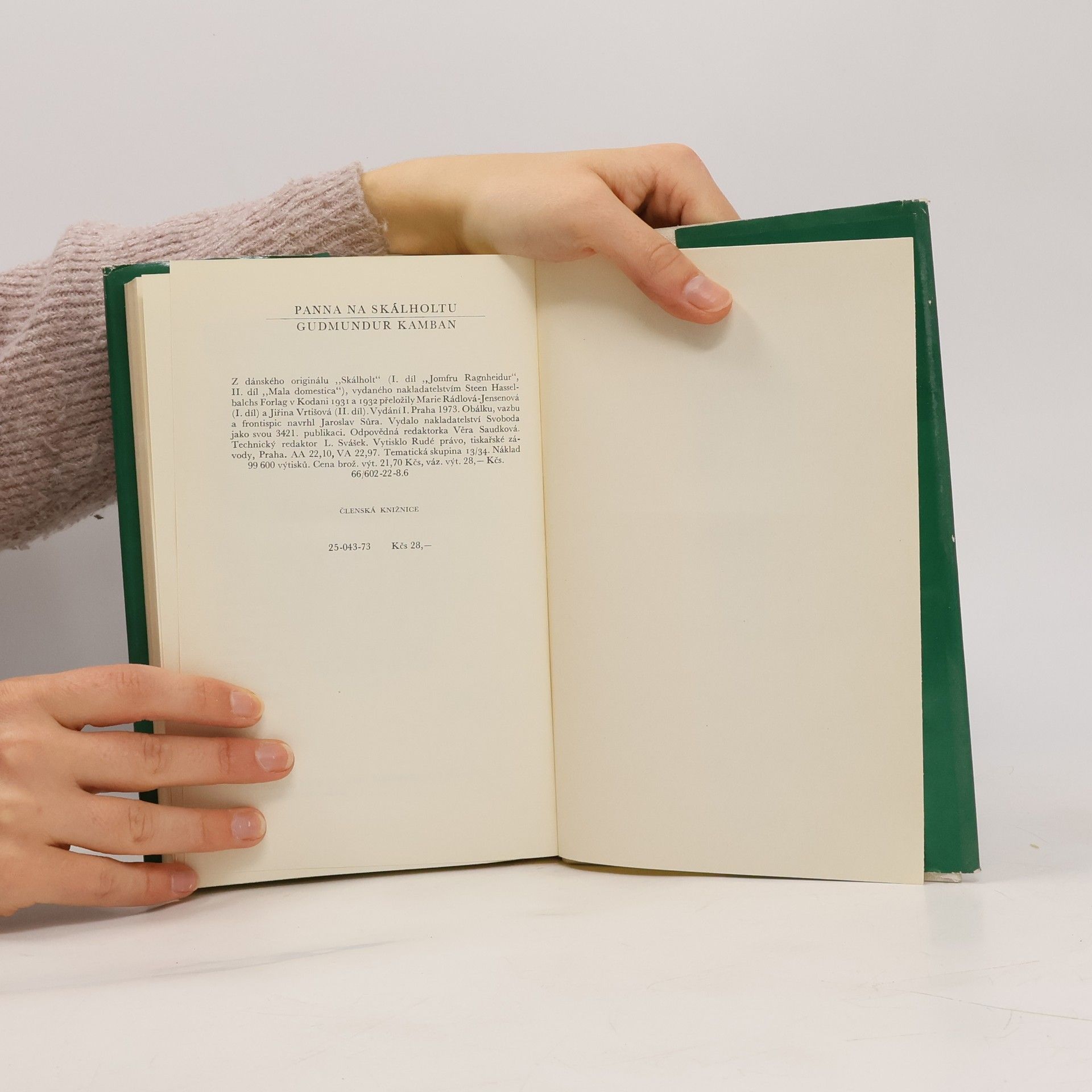 První dva díly (Panna Ragnheidur, Mala domestica) čtyřdílného románového cyklu Skálholt významného představitele zakladatelské generace moderní islandské literatury (1888-1945). Široce koncipovaná sága o tragické lásce dcery islandského biskupa je vyprávěna podle skutečného příběhu z druhé poloviny 17. století. Hrdinka se odmítá provdat za muže ze vznešeného a bohatého rodu, kterého jí zvolil otec, a podléhá svodu mladého kněze a má s ním dítě.Nepochopení a nepřátelství otce pro tento domněle hříšný čin přerušuje jen její nemoc a nakonec smrt. 25-043-73