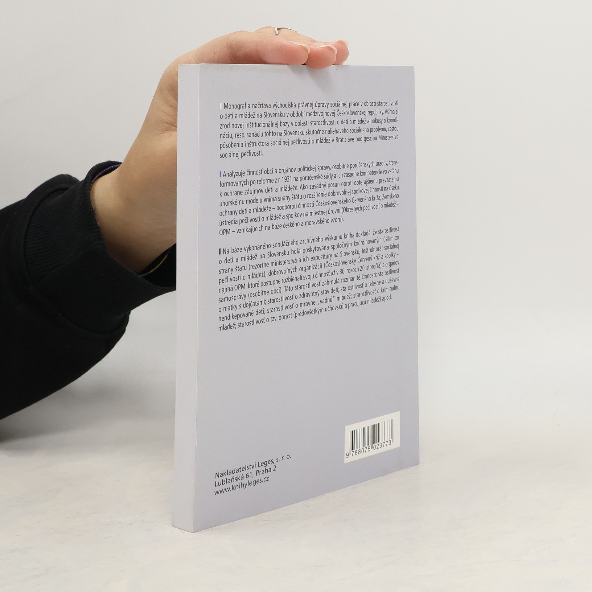 Monografia sa zaoberá právnou úpravou sociálnej práce v oblasti starostlivosti o deti a mládež na Slovensku počas medzivojnovej Československej republiky. Skúma vznik novej inštitucionálnej bázy a pokusy o koordináciu v riešení naliehavého sociálneho problému, pričom sa zameriava na pôsobenie inštruktora sociálnej pečlivosti o mládež v Bratislave pod gesciou Ministerstva sociálnej pečlivosti. Analyzuje činnosť obcí a politických orgánov, najmä poručenských úradov a poručenských súdov po reforme z roku 1931, a ich kompetencie v ochrane záujmov detí a mládeže. Zásadným posunom oproti uhorskému modelu sú snahy štátu o podporu dobrovoľnej činnosti v oblasti ochrany detí a mládeže, vrátane aktivít Československého Červeného kríža a miestnych spolkov (Okresné pečlivosti o mládež). Kniha na základe archívneho výskumu dokladá, že starostlivosť o deti a mládež bola výsledkom koordinovaného úsilia štátu, dobrovoľných organizácií a samosprávy. Starostlivosť zahŕňala rôzne aktivity, ako sú podpora matiek s dojčatami, zdravotná starostlivosť o deti, pomoc telesne a duševne hendikepovaným, podpora mravne „vadnej“ mládeže a starostlivosť o kriminálnu mládež.