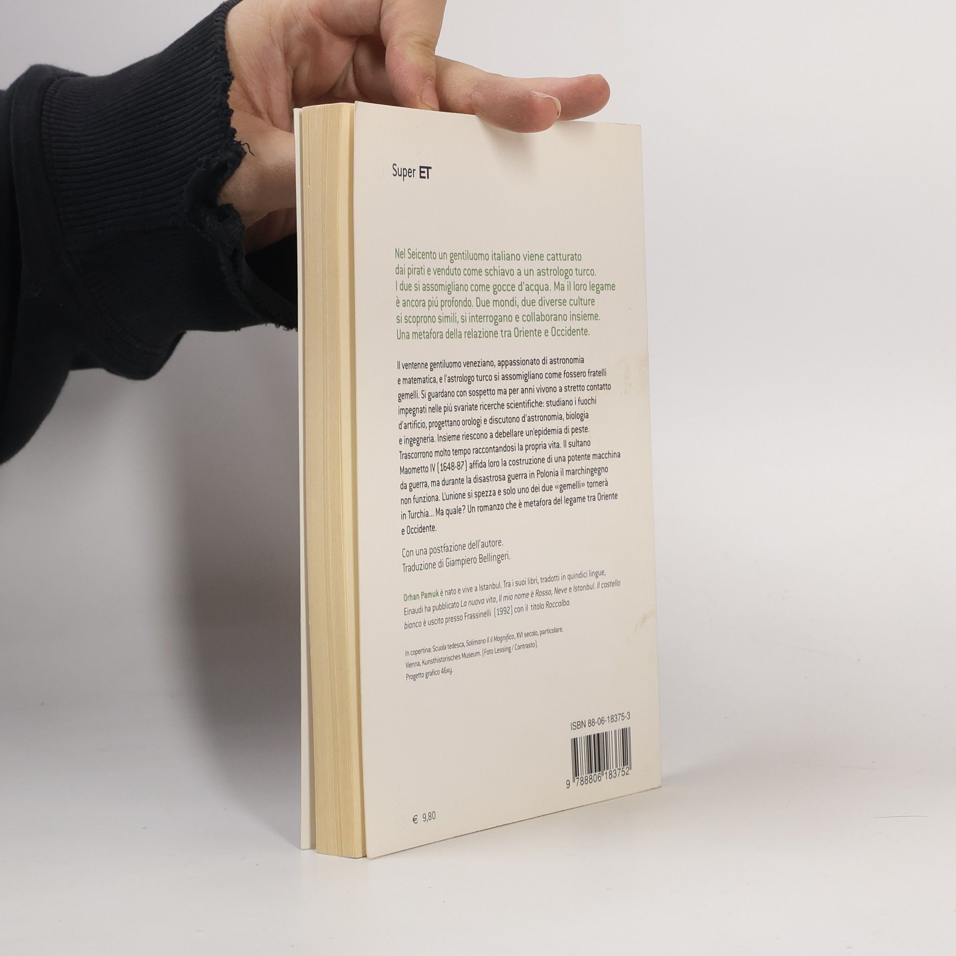 Il ventenne gentiluomo veneziano, appassionato di astronomia e matematica, e l'astrologo turco si assomigliano come fossero fratelli gemelli. Si guardano con sospetto ma per anni vivono a stretto contatto impegnati nelle più svariate ricerche scientifiche: studiano i fuochi d'artificio, progettano orologi e discutono d'astronomia, biologia e ingegneria. Insieme riescono a debellare un'epidemia di peste. Trascorrono molto tempo raccontandosi la propria vita. Il sultano Maometto IV (1648-87) affida loro la costruzione di una potente macchina da guerra, ma durante la disastrosa guerra in Polonia il marchingegno non funziona. L'unione si spezza e solo uno dei due "gemelli" tornerà in Turchia... Ma quale? Un romanzo che è metafora del legame tra Oriente e Occidente.