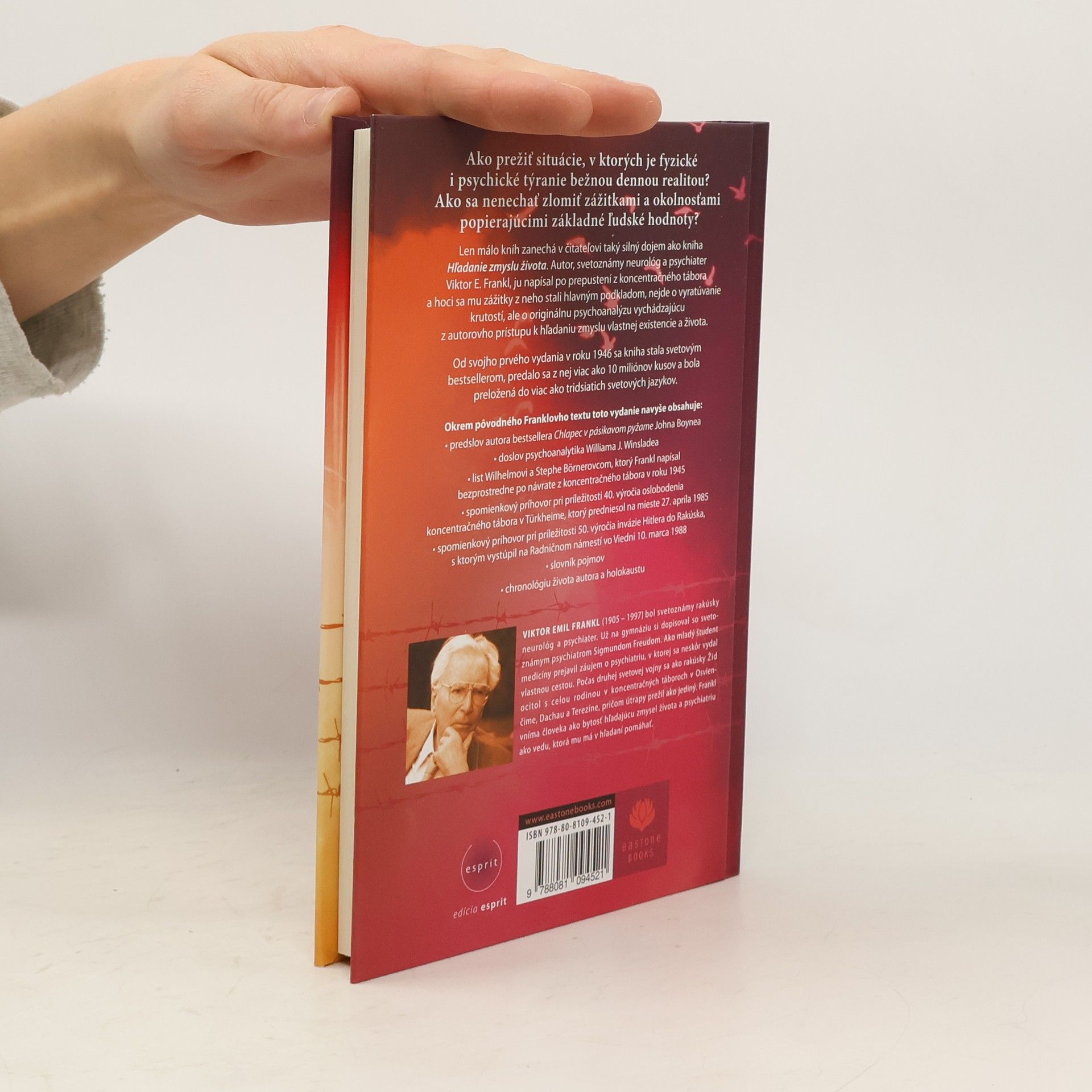 Len málo kníh zanechá v čitateľovi taký silný dojem ako táto. Autor, svetoznámy neurológ a psychiater, ju napísal po prepustení z koncentračného tábora, no nejde o vyratúvanie krutostí, ale o originálnu psychoanalýzu vychádzajúcu z autorovho prístupu k hľadaniu zmyslu vlastnej existencie a života. Doteraz sa z nej predalo viac ako 10 miliónov výtlačkov a bola preložená do vyše 30 jazykov. Toto vydanie navyše obsahuje: predslov autora bestsellera Chlapec v pásikavom pyžame, doslov psychoanalytika, list, ktorý Frankl napísal bezprostredne po návrate z koncentračného tábora v roku 1945, spomienkový príhovor pri príležitosti 40. výročia oslobodenia koncentračného tábora v Türkheime, spomienkový príhovor pri príležitosti 50. výročia invázie Hitlera do Rakúska, slovník pojmov a chronológiu života autora a holokaustu.
