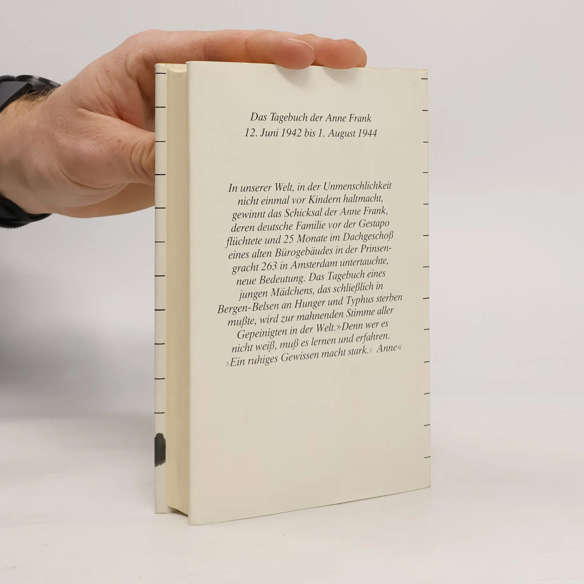 Die weltweit gültige und verbindliche Fassung des Tagebuchs von Anne Frank, autorisiert vom Anne Frank Fonds Basel, vereint Symbolik und Dokumentation. Es steht für den Völkermord an den Juden durch die Nazis und dokumentiert das Leben einer talentierten jungen Schriftstellerin. Diese Ausgabe ist die einzige autorisierte Fassung, die Annes überarbeitete Texte enthält, ohne die von ihrem Vater Otto Frank vorgenommenen Auslassungen. Mirjam Pressler hat eine neue, dem Stil des Originals entsprechende Übersetzung erarbeitet. Der vollständige Text vermittelt ein eindrucksvolles Bild von Annes Gefühls- und Gedankenwelt sowie ihren Fortschritten als Schriftstellerin. Anne Frank fragte sich: „Werde ich jemals Journalistin und Schriftstellerin werden? Ich hoffe es, ich hoffe es so sehr!“ Anne hinterließ zwei fragmentarische Tagebuchversionen: Version a ist der ursprüngliche Text, während Version b ihre unvollendete Bearbeitung darstellt, die 1986 veröffentlicht wurde. Version c war die erste Fassung, die Otto Frank 1947 veröffentlichte, wobei er sensible Stellen entfernte. Diese Version ist seit 1990 nicht mehr erhältlich. Version d, die vom Anne Frank Fonds autorisierte Leseausgabe, vereint die ungekürzten Texte der Versionen a und b und ist seit 1991 die verbindliche Grundlage für Übersetzungen in über 80 Sprachen. Alle Versionen, außer Version c, sind in verschiedenen Ausgaben von Mirjam Pressler im S. Fischer Verlag erhältlich.