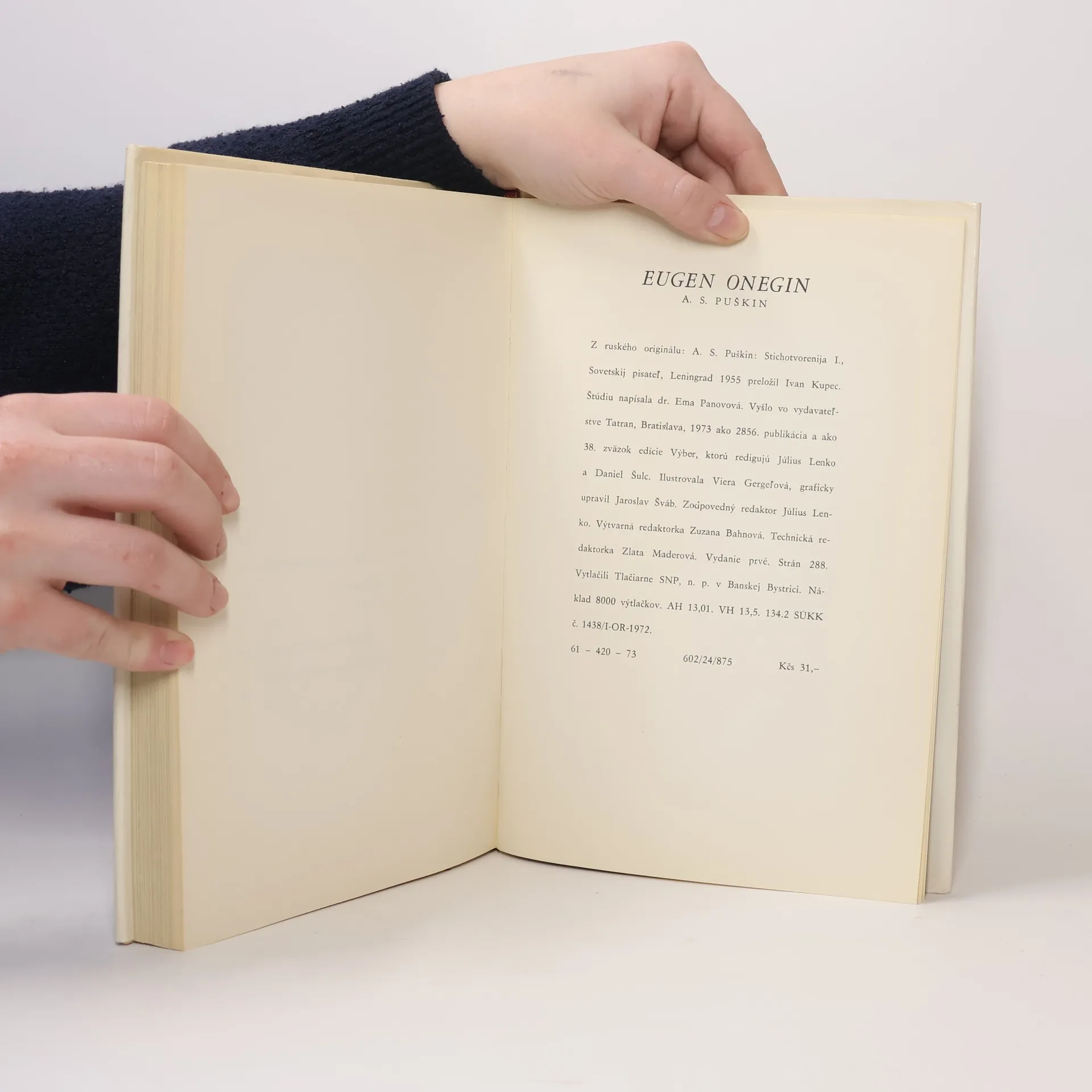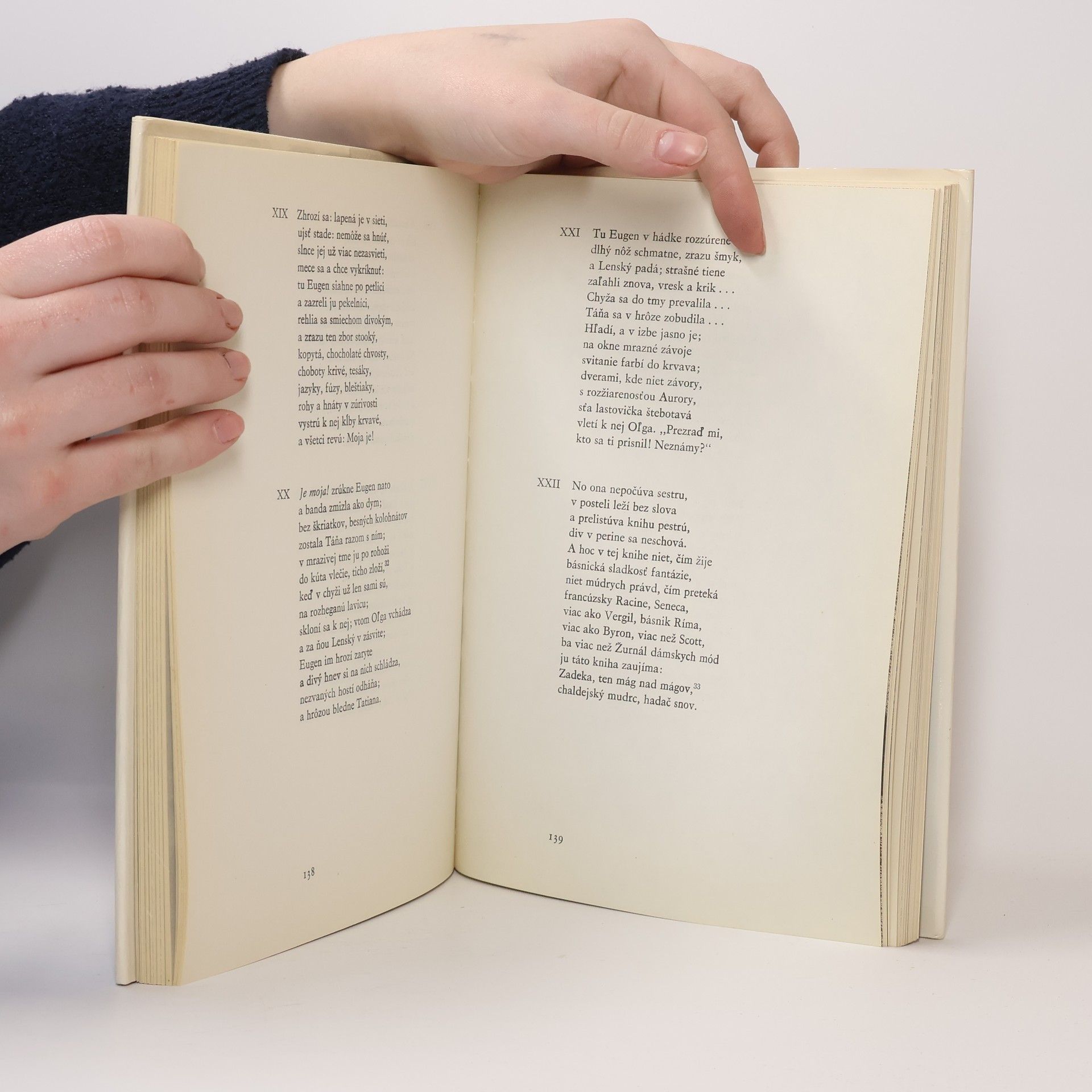 „Už mnoho, mnoho prešlo dní / od tých čias, ako mladú Táňu / a Eugena s ňou videl som, / trápený roztúženým snom, / dať všetko toto do románu / cez kryštál magický som chcel, / no ešte jasne nevidel.“ Veršovaný román A. S. Puškina v preklade Janka Jesenského. Klasika zo Zlatého fondu SME. Digitalizovaná podoba publikace: Alexander Sergejevič Puškin. Eugen Onegin. Román vo veršoch. Matica slovenská. Turčiansky Svätý Martin 1942. 240 s. Janko Jesenský preložil. Stanislav Mečiar rediguje.