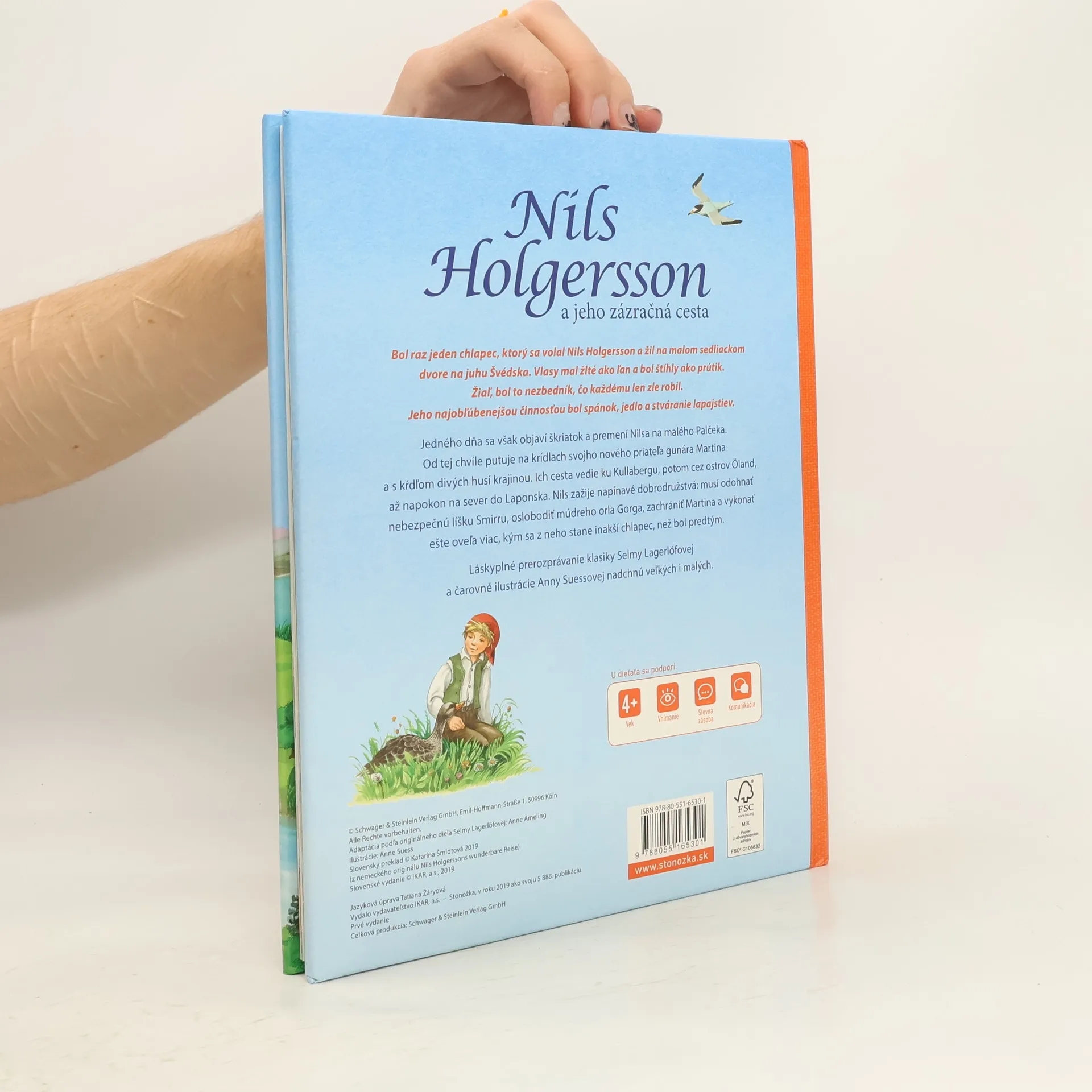 Bol raz jeden chlapec, ktorý sa volal Nils Holgersson a žil na malom sedliackom dvore na juhu Švédska. Vlasy mal žlté ako ľan a bol štíhly ako prútik. Žiaľ, bol to nezbedník, čo každému len zle robil. Jeho najobľúbenejšou činnosťou bol spánok, jedlo a stváranie lapajstiev. Jedného dňa sa však objaví škriatok a premení Nilsa na malého Palčeka. Od tej chvíle putuje na krídlach svojho nového priateľa gunára Martina a s kŕdľom divých husí krajinou. Ich cesta vedie ku Kullabergu, potom cez ostrov Öland, až napokon na sever do Laponska. Nils zažije napínavé dobrodružstvá: musí odohnať nebezpečnú líšku Smirru, oslobodiť múdreho orla Gorga, zachrániť Martina a vykonať ešte oveľa viac, kým sa z neho stane inakší chlapec, než bol predtým. Láskyplné prerozprávanie klasiky Selmy Lagerlöfovej a čarovné ilustrácie Anny Suessovej nadchnú veľkých i malých. Pre deti od 4 rokov.