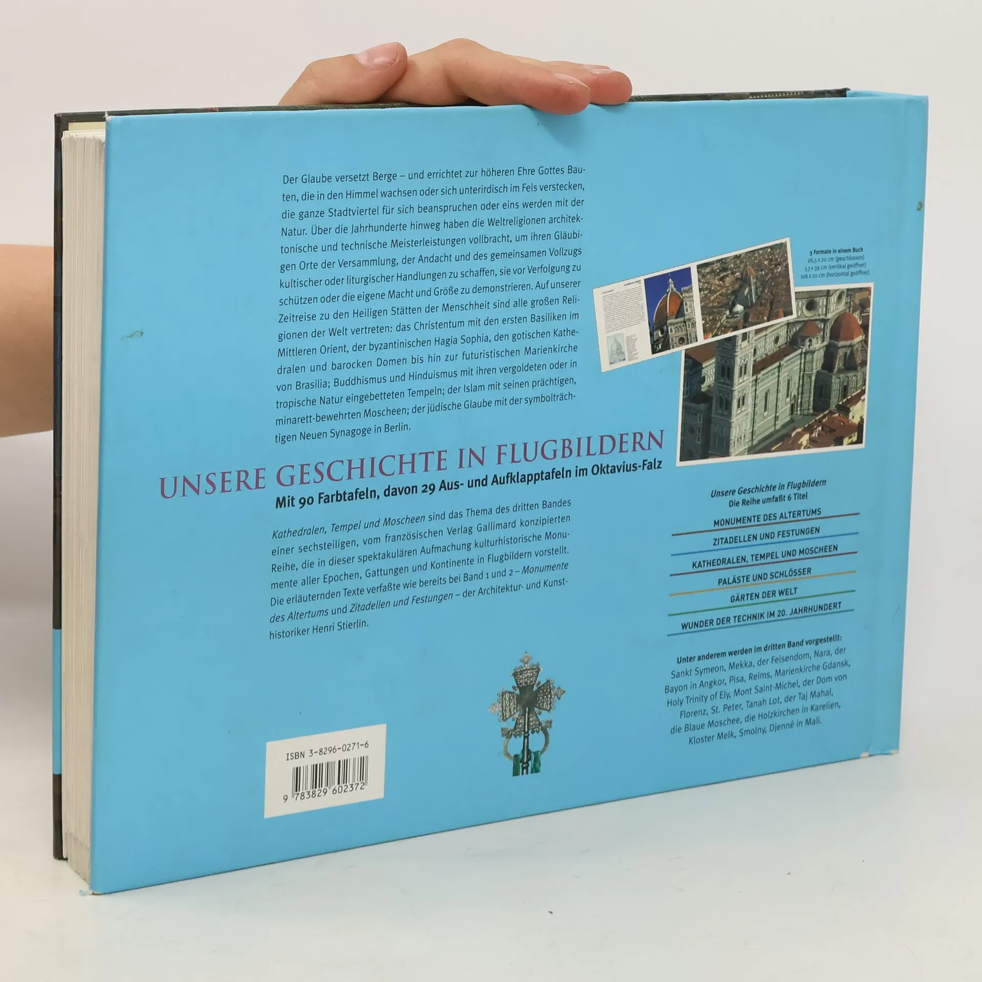 Nach den Monumenten des Altertums, die von unseren Lesern mit großer Begeisterung aufgenommen wurden, stellt Henri Stierlin im 2. Band der Gallimard-Reihe „Unsere Geschichte in Flugbildern“ Zitadellen und Festungen vor. Bauten zur Verteidigung und zum Schutz gegen Angreifer gehören wie der Krieg zur Menschheitsgeschichte. Seit ihren Anfängen und in allen Zeitaltern und Kulturen wurden Bastionen gebaut, Mauern errichtet, ganze Städte und Landstriche befestigt. Eine der ältesten erhaltenen Verteidigungsanlagen, Dún Aengus auf einer kleinen irischen Insel im Atlantik, ist zugleich auch die imposanteste und rätselhafteste. Sie steht am Anfang unserer Zeitreise durch die Weltgeschichte der Militärbaukunst, die je nach Bedarf, Regierungsform und geographischer Lage mehr oder weniger martialisch ausfiel: die Chinesische Mauer, die Kreuzritterburg Krak des Chevaliers in Syrien, Castel del Monte in Apulien, die Festungsstadt Carcassonne, der Tower of London, die Engelsburg in Rom, das 2003 von einem Erdbeben zerstörte Bam im Iran. bis hin zum Hochsicherheitsgefängnis Alcatraz in der Bucht von San Francisco und den deutschen Bunkern des Atlantikwalls. In der Reihe Unsere Geschichte in Flugbildern erschien bereits Band 1: Die großen Monumente des Altertums. Die Reihe wird fortgesetzt mit Band 3: Tempel, Moscheen und Kathedralen Band 4: Paläste und Schlösser Band 5: Gärten der Welt Band 6: Wunder der Technik im 20. Jahrhundert